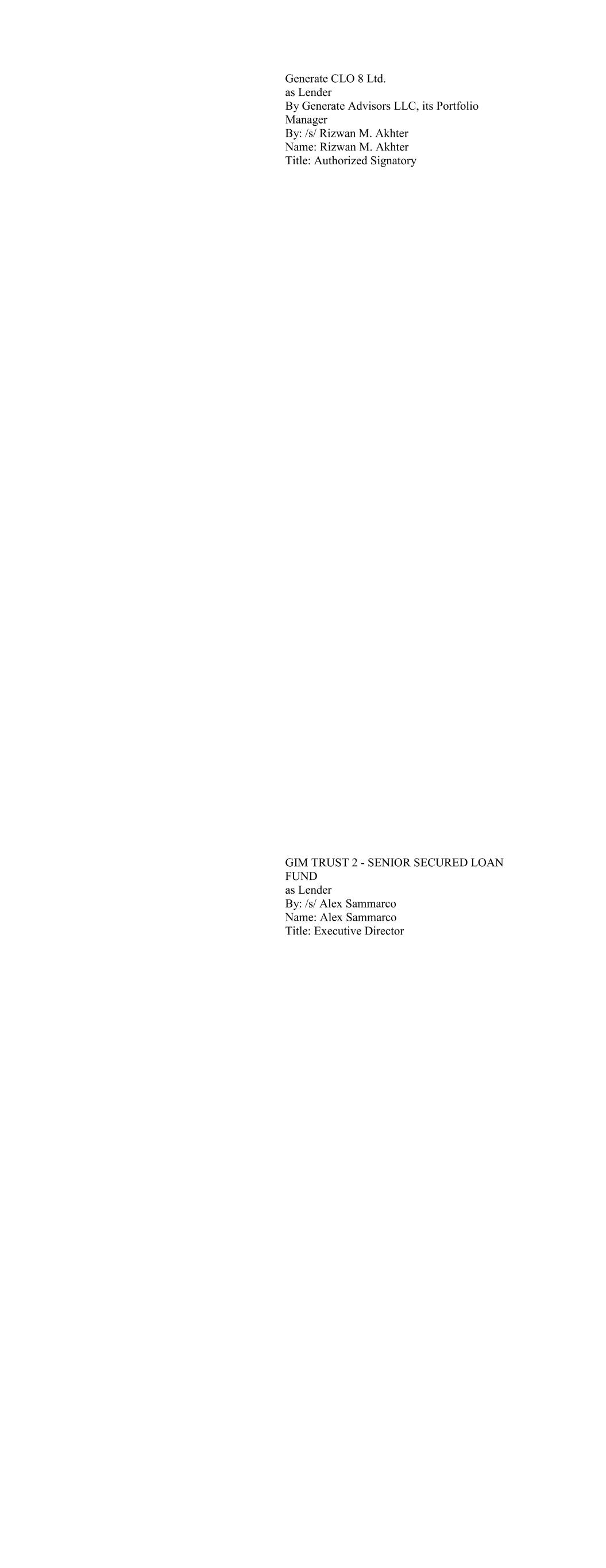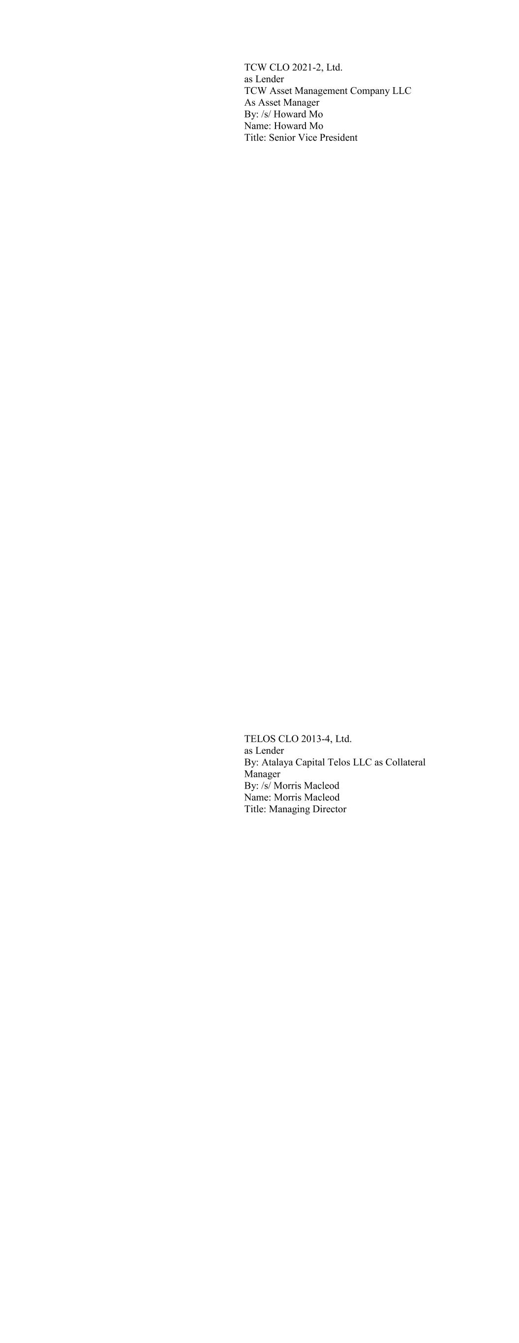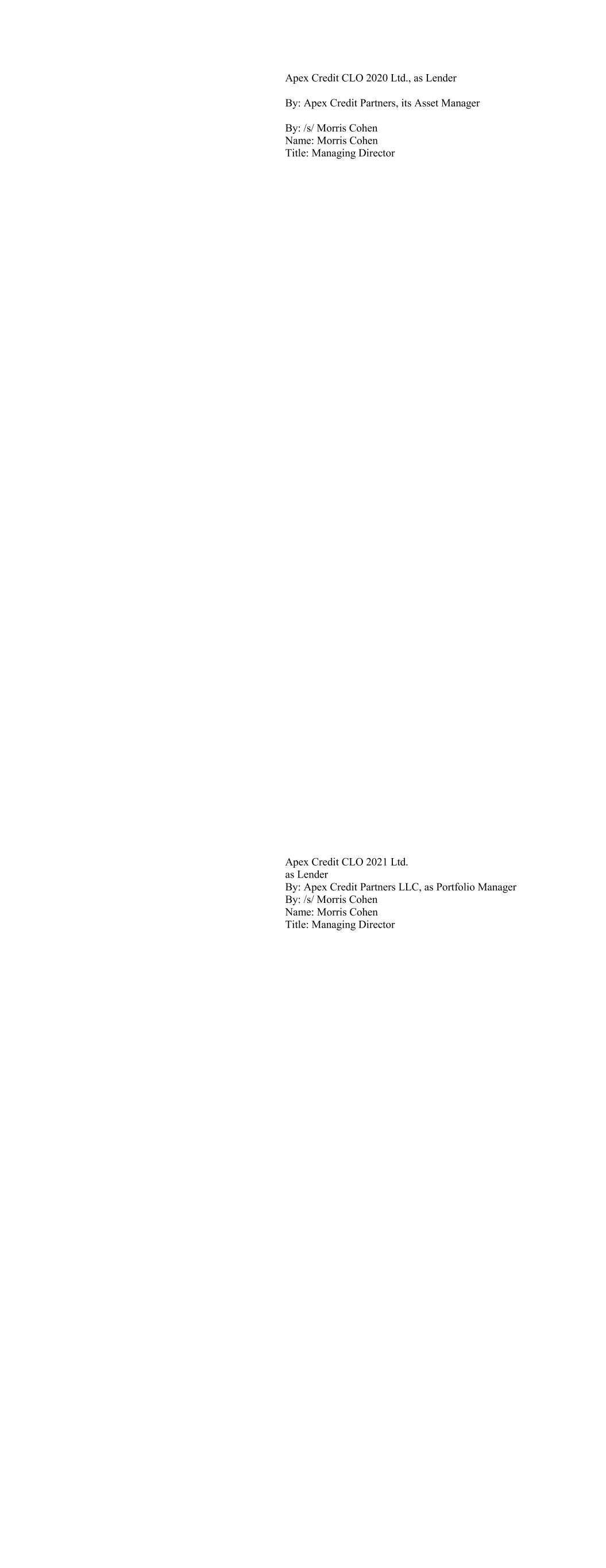 Apex Credit CLO 2020 Ltd., as Lender By: Apex Credit Partners, its Asset Manager By: /s/ Morris Cohen Name: Morris Cohen Title: Managing Director Apex Credit CLO 2021 Ltd. as Lender By: Apex Credit Partners LLC, as Portfolio Manager By: /s/ Morris Cohen Name: Morris Cohen Title: Managing Director