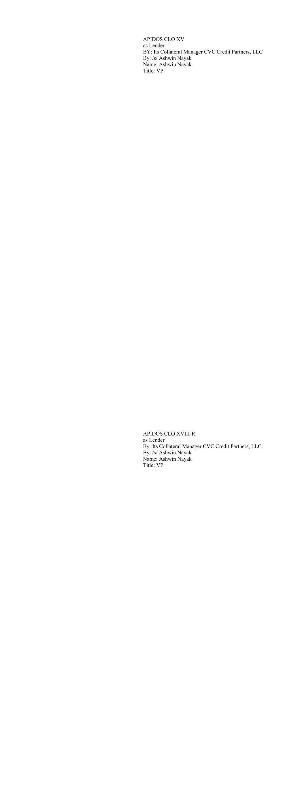 APIDOS CLO XV as Lender BY: Its Collateral Manager CVC Credit Partners, LLC By: /s/ Ashwin Nayak Name: Ashwin Nayak Title: VP APIDOS CLO XVIII-R as Lender By: Its Collateral Manager CVC Credit Partners, LLC By: /s/ Ashwin Nayak Name: Ashwin Nayak Title: VP