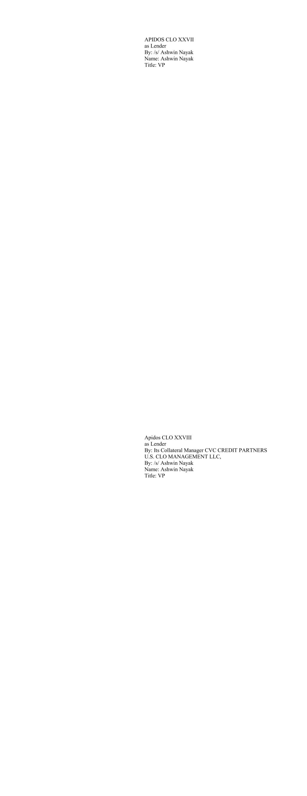 APIDOS CLO XXVII as Lender By: /s/ Ashwin Nayak Name: Ashwin Nayak Title: VP Apidos CLO XXVIII as Lender By: Its Collateral Manager CVC CREDIT PARTNERS U.S. CLO MANAGEMENT LLC, By: /s/ Ashwin Nayak Name: Ashwin Nayak Title: VP