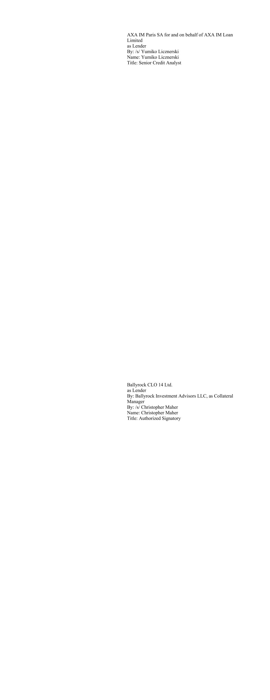 AXA IM Paris SA for and on behalf of AXA IM Loan Limited as Lender By: /s/ Yumiko Licznerski Name: Yumiko Licznerski Title: Senior Credit Analyst Ballyrock CLO 14 Ltd. as Lender By: Ballyrock Investment Advisors LLC, as Collateral Manager By: /s/ Christopher Maher Name: Christopher Maher Title: Authorized Signatory