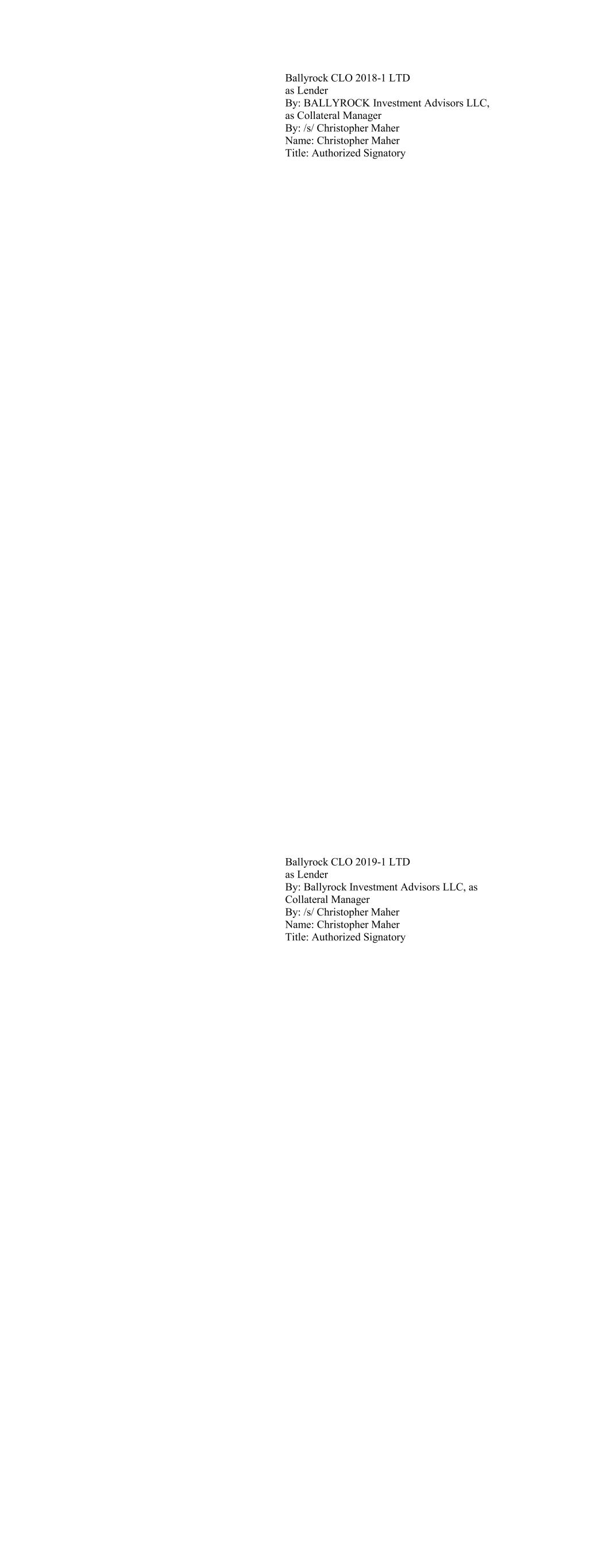 Ballyrock CLO 2018-1 LTD as Lender By: BALLYROCK Investment Advisors LLC, as Collateral Manager By: /s/ Christopher Maher Name: Christopher Maher Title: Authorized Signatory Ballyrock CLO 2019-1 LTD as Lender By: Ballyrock Investment Advisors LLC, as Collateral Manager By: /s/ Christopher Maher Name: Christopher Maher Title: Authorized Signatory