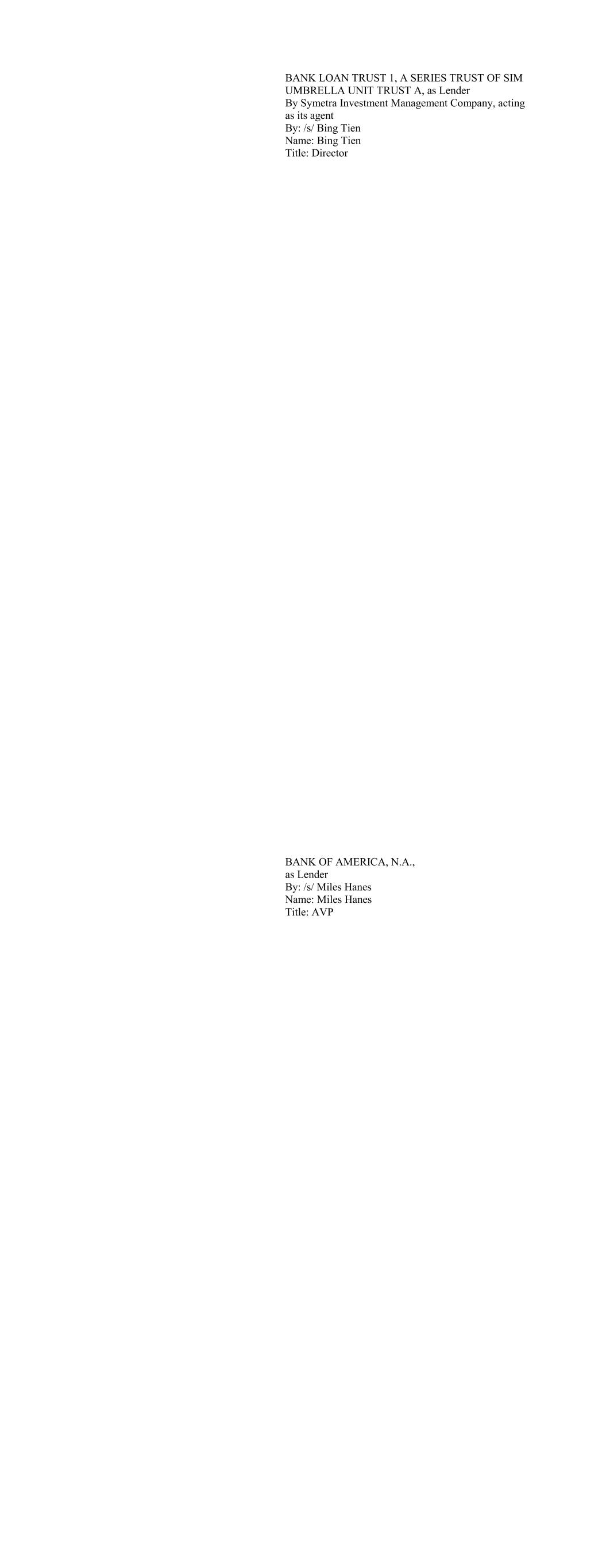 BANK LOAN TRUST 1, A SERIES TRUST OF SIM UMBRELLA UNIT TRUST A, as Lender By Symetra Investment Management Company, acting as its agent By: /s/ Bing Tien Name: Bing Tien Title: Director BANK OF AMERICA, N.A., as Lender By: /s/ Miles Hanes Name: Miles Hanes Title: AVP