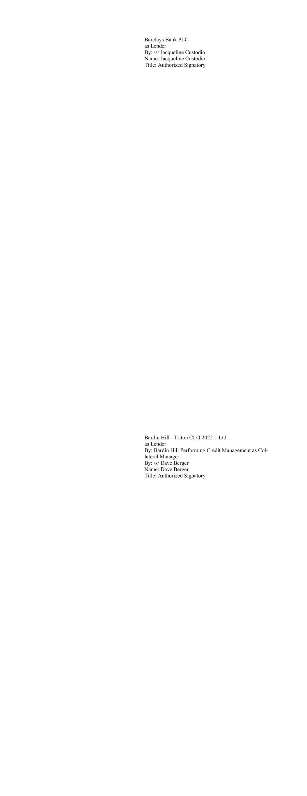 Barclays Bank PLC as Lender By: /s/ Jacqueline Custodio Name: Jacqueline Custodio Title: Authorized Signatory Bardin Hill - Triton CLO 2022-1 Ltd. as Lender By: Bardin Hill Performing Credit Management as Col- lateral Manager By: /s/ Dave Berger Name: Dave Berger Title: Authorized Signatory