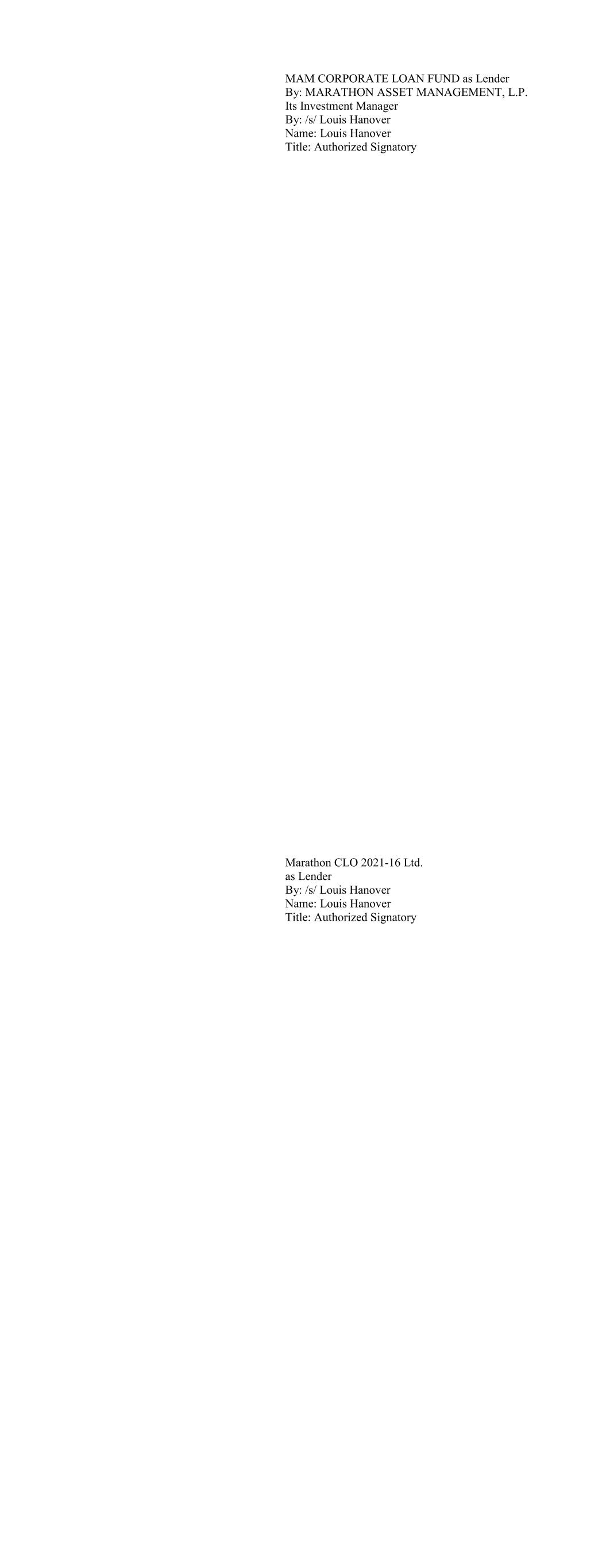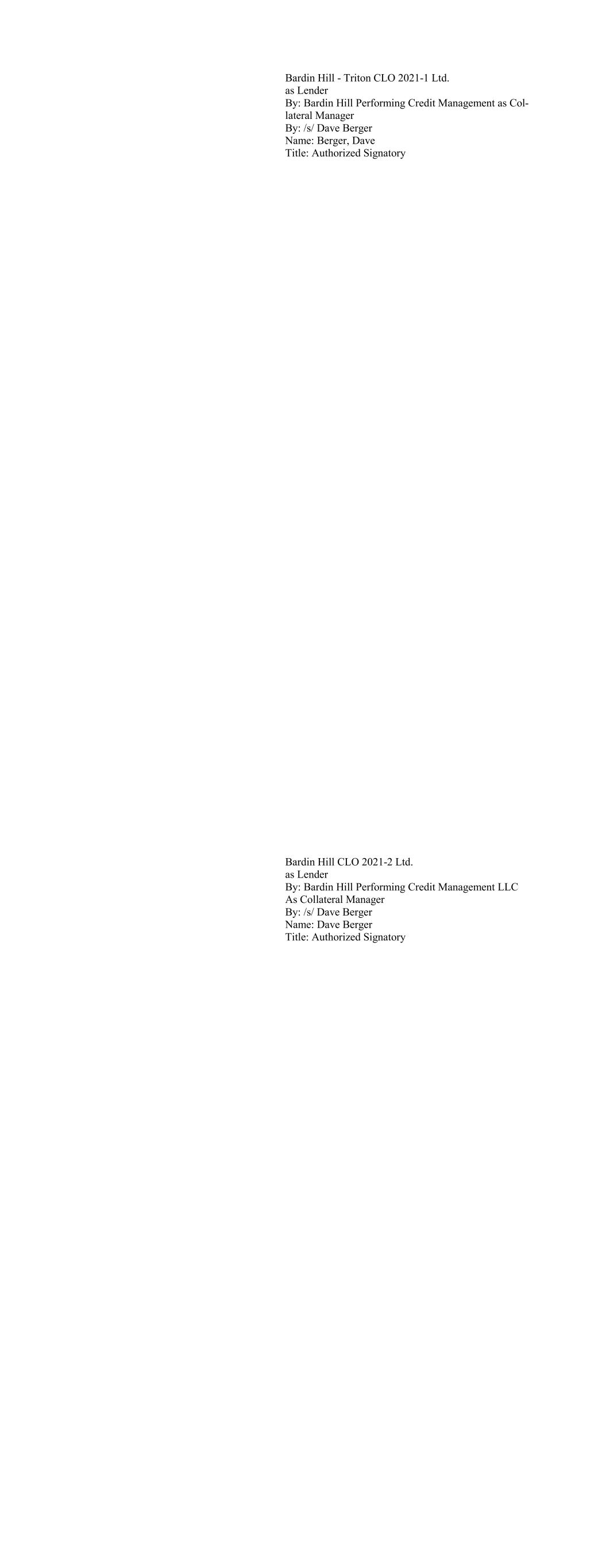 Bardin Hill - Triton CLO 2021-1 Ltd. as Lender By: Bardin Hill Performing Credit Management as Col- lateral Manager By: /s/ Dave Berger Name: Berger, Dave Title: Authorized Signatory Bardin Hill CLO 2021-2 Ltd. as Lender By: Bardin Hill Performing Credit Management LLC As Collateral Manager By: /s/ Dave Berger Name: Dave Berger Title: Authorized Signatory