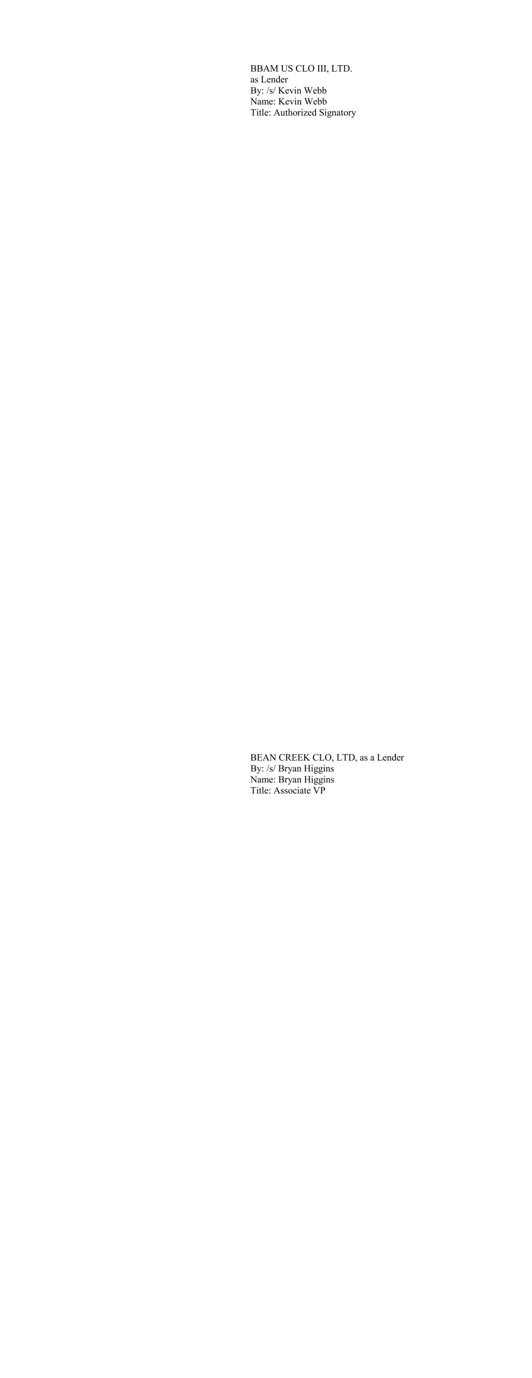 BBAM US CLO III, LTD. as Lender By: /s/ Kevin Webb Name: Kevin Webb Title: Authorized Signatory BEAN CREEK CLO, LTD, as a Lender By: /s/ Bryan Higgins Name: Bryan Higgins Title: Associate VP