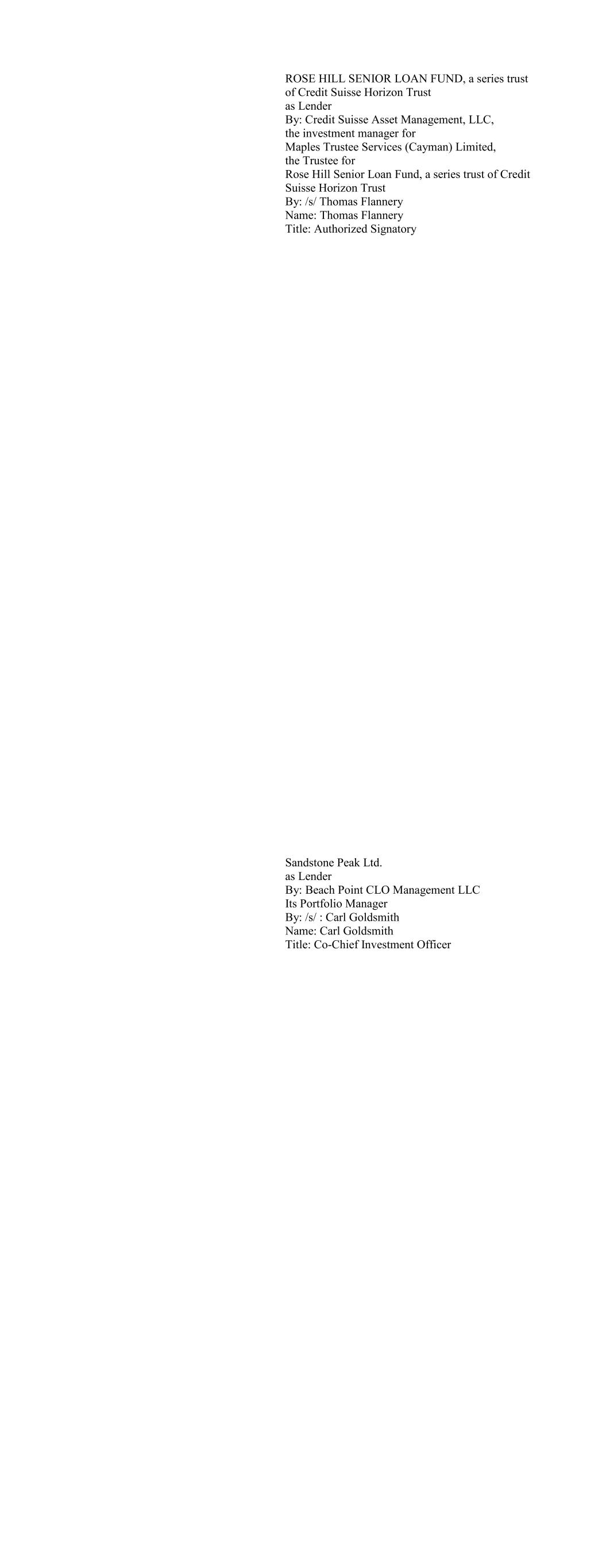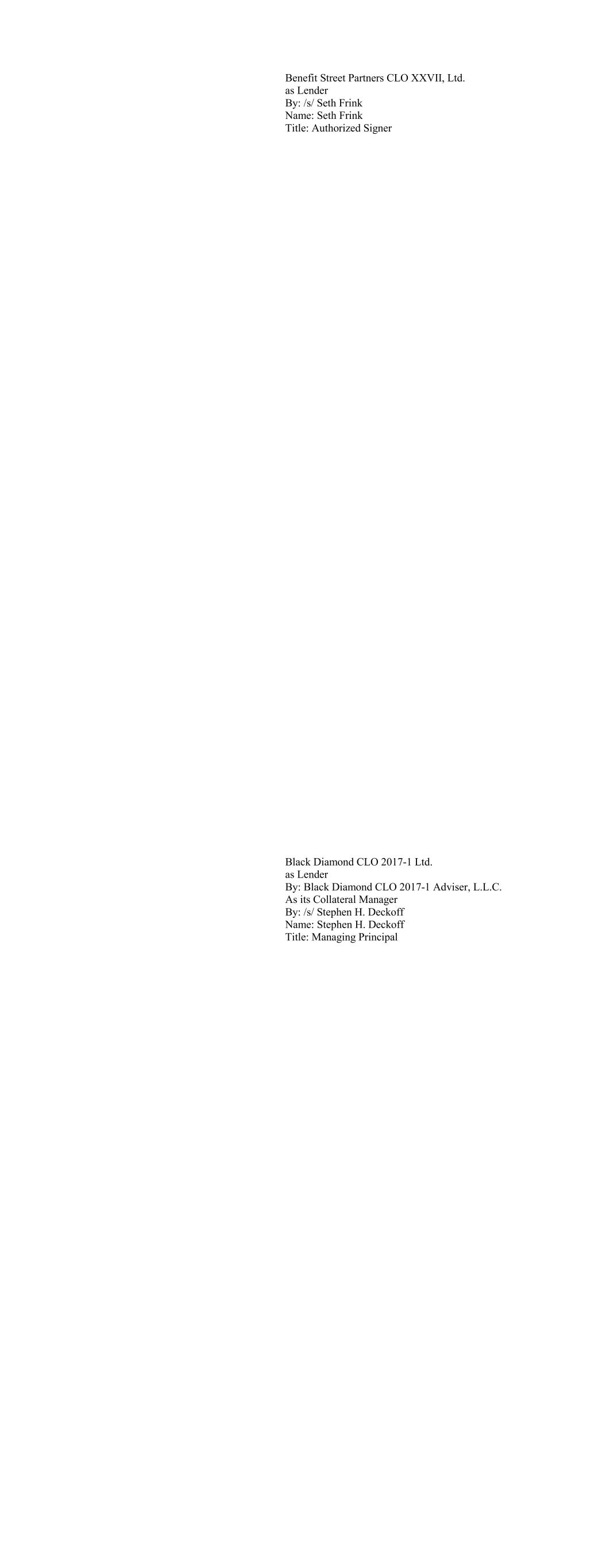 Benefit Street Partners CLO XXVII, Ltd. as Lender By: /s/ Seth Frink Name: Seth Frink Title: Authorized Signer Black Diamond CLO 2017-1 Ltd. as Lender By: Black Diamond CLO 2017-1 Adviser, L.L.C. As its Collateral Manager By: /s/ Stephen H. Deckoff Name: Stephen H. Deckoff Title: Managing Principal
