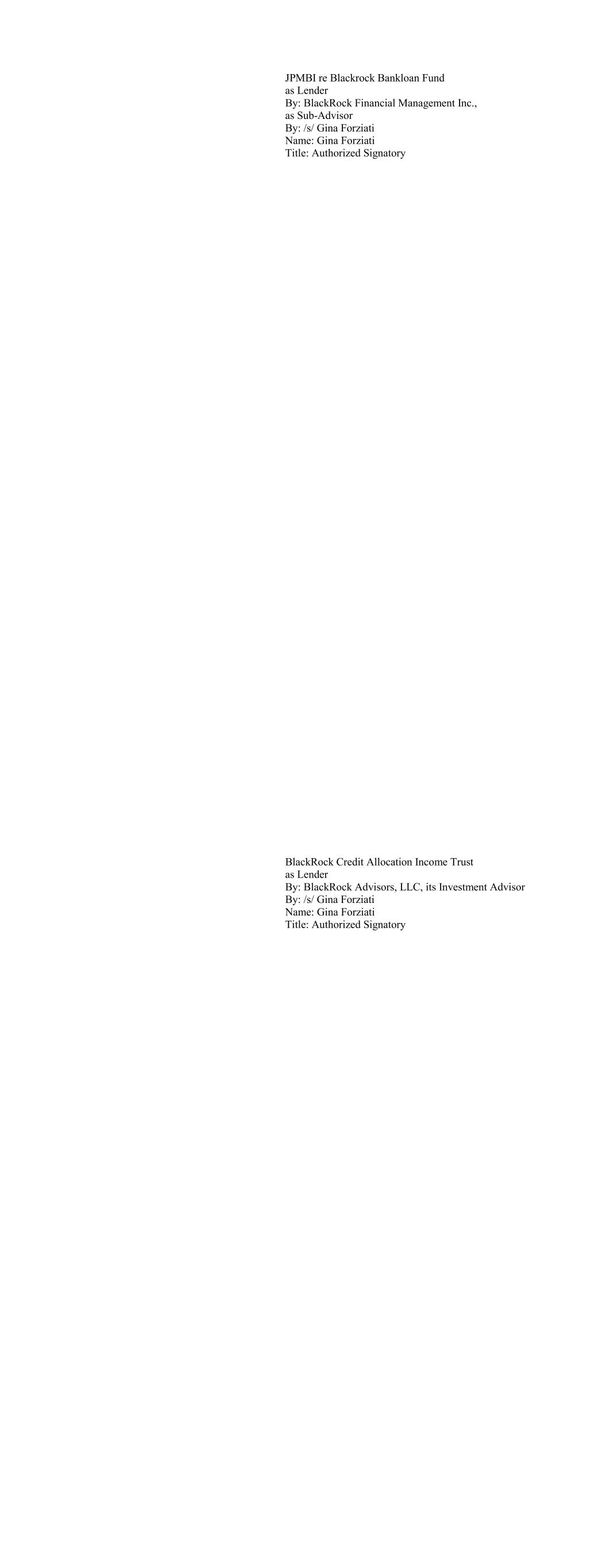 JPMBI re Blackrock Bankloan Fund as Lender By: BlackRock Financial Management Inc., as Sub-Advisor By: /s/ Gina Forziati Name: Gina Forziati Title: Authorized Signatory BlackRock Credit Allocation Income Trust as Lender By: BlackRock Advisors, LLC, its Investment Advisor By: /s/ Gina Forziati Name: Gina Forziati Title: Authorized Signatory