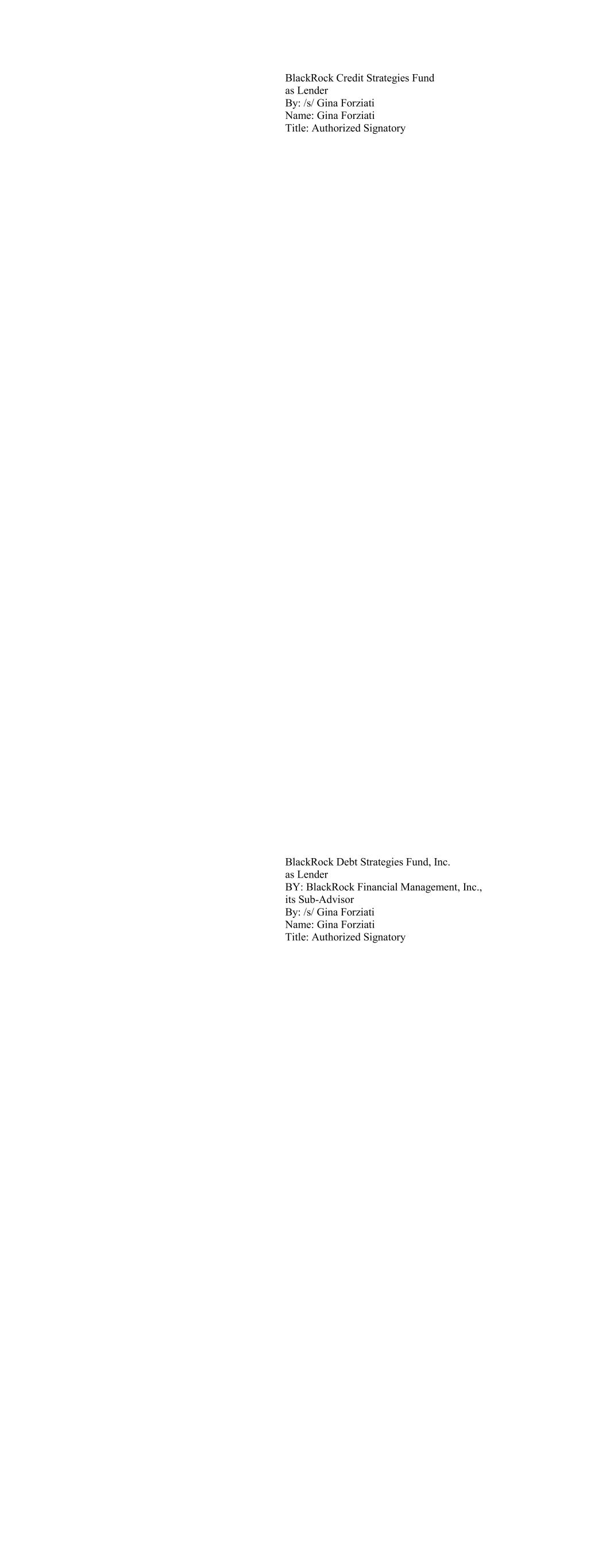 BlackRock Credit Strategies Fund as Lender By: /s/ Gina Forziati Name: Gina Forziati Title: Authorized Signatory BlackRock Debt Strategies Fund, Inc. as Lender BY: BlackRock Financial Management, Inc., its Sub-Advisor By: /s/ Gina Forziati Name: Gina Forziati Title: Authorized Signatory