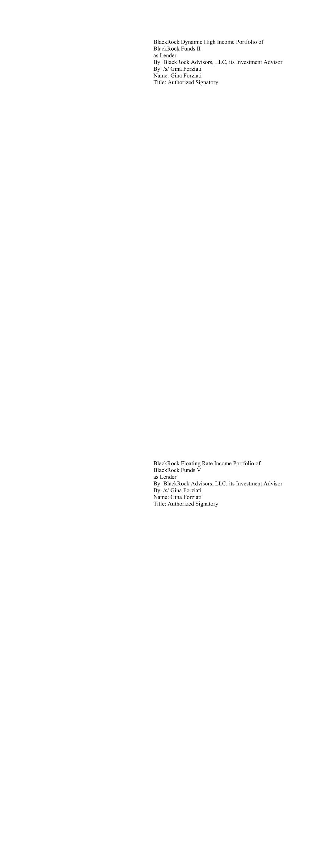 BlackRock Dynamic High Income Portfolio of BlackRock Funds II as Lender By: BlackRock Advisors, LLC, its Investment Advisor By: /s/ Gina Forziati Name: Gina Forziati Title: Authorized Signatory BlackRock Floating Rate Income Portfolio of BlackRock Funds V as Lender By: BlackRock Advisors, LLC, its Investment Advisor By: /s/ Gina Forziati Name: Gina Forziati Title: Authorized Signatory