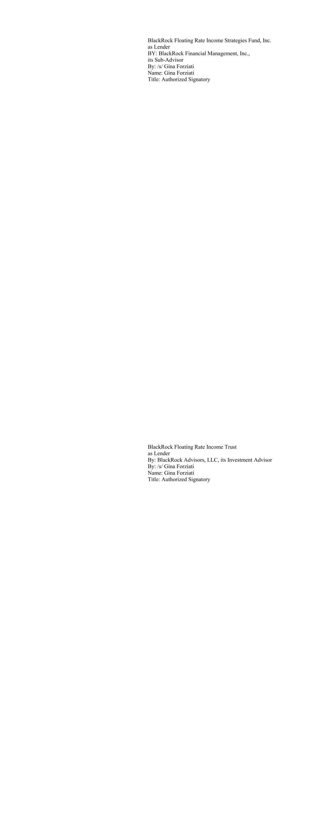 BlackRock Floating Rate Income Strategies Fund, Inc. as Lender BY: BlackRock Financial Management, Inc., its Sub-Advisor By: /s/ Gina Forziati Name: Gina Forziati Title: Authorized Signatory BlackRock Floating Rate Income Trust as Lender By: BlackRock Advisors, LLC, its Investment Advisor By: /s/ Gina Forziati Name: Gina Forziati Title: Authorized Signatory