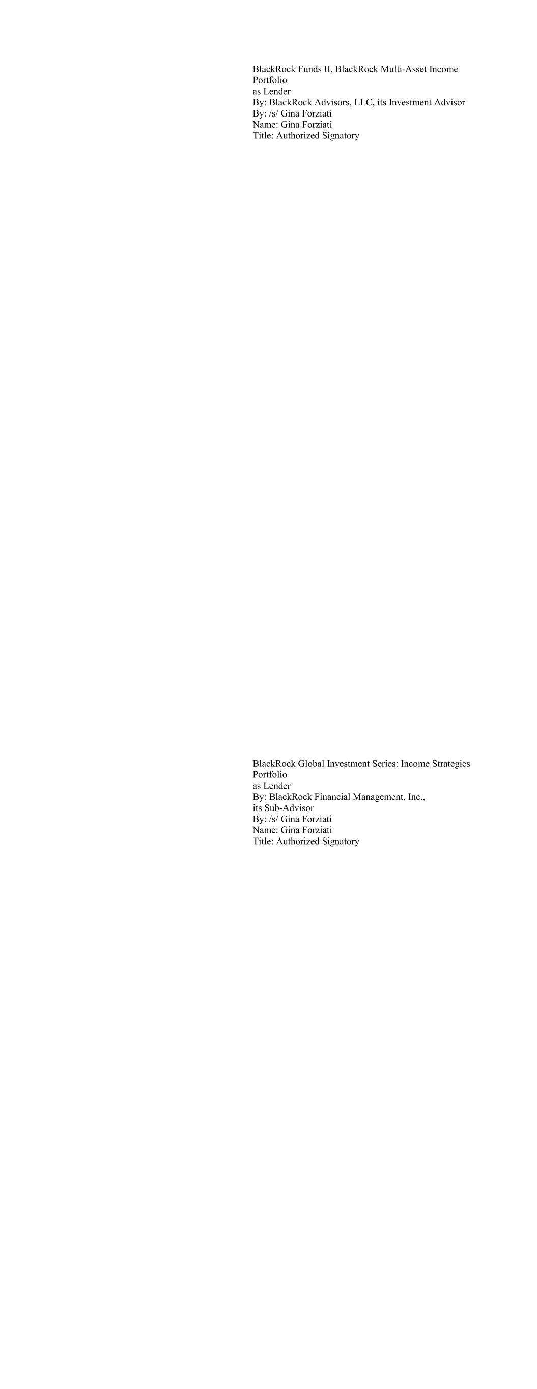 BlackRock Funds II, BlackRock Multi-Asset Income Portfolio as Lender By: BlackRock Advisors, LLC, its Investment Advisor By: /s/ Gina Forziati Name: Gina Forziati Title: Authorized Signatory BlackRock Global Investment Series: Income Strategies Portfolio as Lender By: BlackRock Financial Management, Inc., its Sub-Advisor By: /s/ Gina Forziati Name: Gina Forziati Title: Authorized Signatory