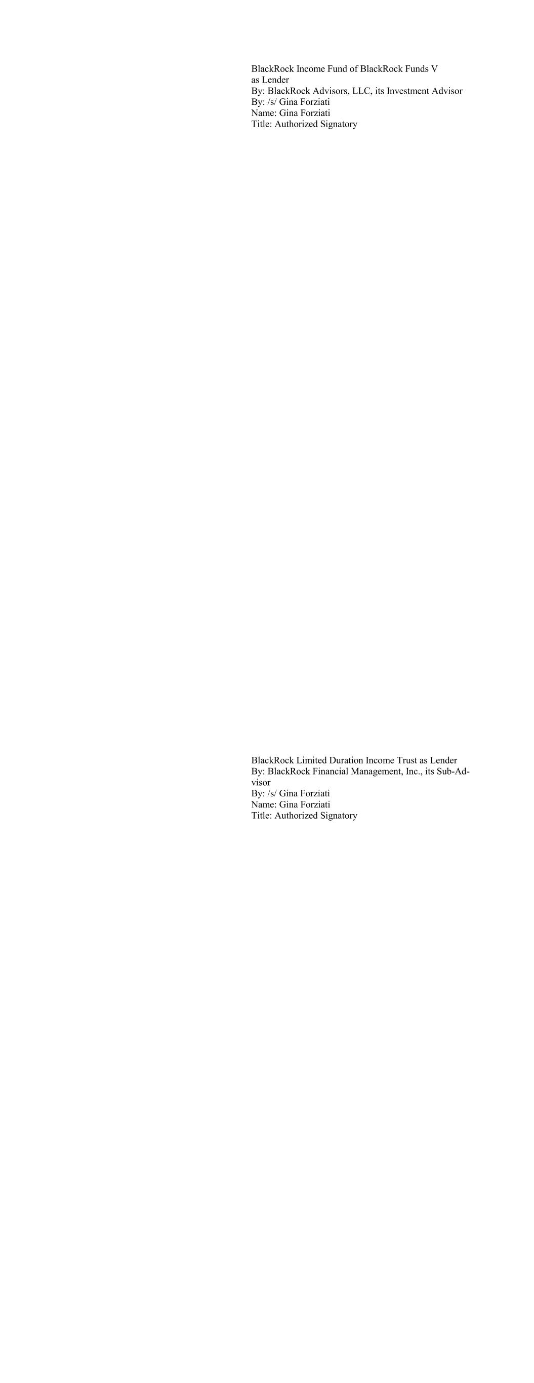 BlackRock Income Fund of BlackRock Funds V as Lender By: BlackRock Advisors, LLC, its Investment Advisor By: /s/ Gina Forziati Name: Gina Forziati Title: Authorized Signatory BlackRock Limited Duration Income Trust as Lender By: BlackRock Financial Management, Inc., its Sub-Ad- visor By: /s/ Gina Forziati Name: Gina Forziati Title: Authorized Signatory