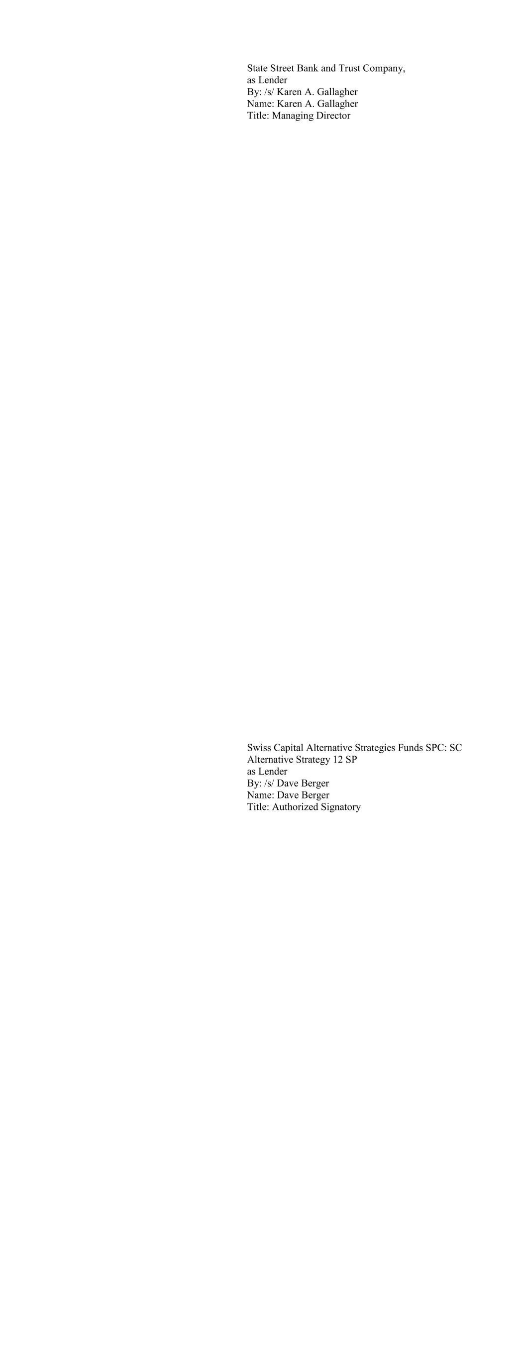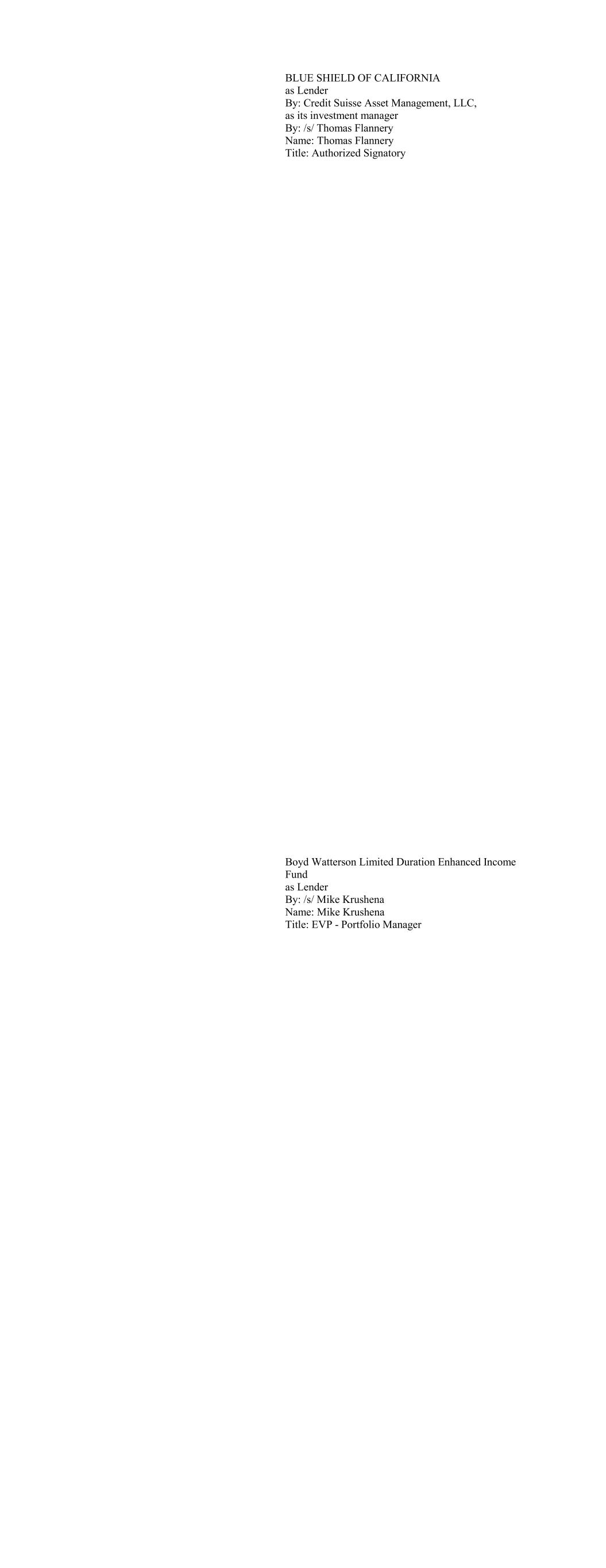 BLUE SHIELD OF CALIFORNIA as Lender By: Credit Suisse Asset Management, LLC, as its investment manager By: /s/ Thomas Flannery Name: Thomas Flannery Title: Authorized Signatory Boyd Watterson Limited Duration Enhanced Income Fund as Lender By: /s/ Mike Krushena Name: Mike Krushena Title: EVP - Portfolio Manager