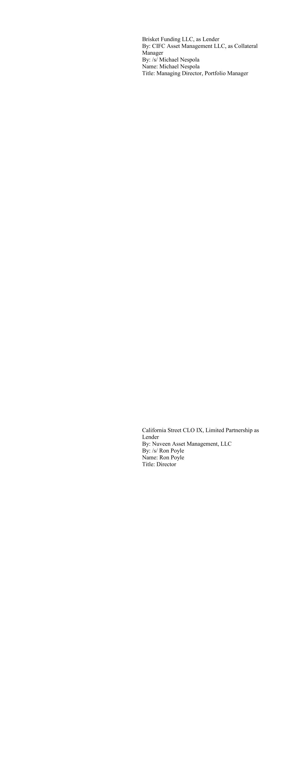 Brisket Funding LLC, as Lender By: CIFC Asset Management LLC, as Collateral Manager By: /s/ Michael Nespola Name: Michael Nespola Title: Managing Director, Portfolio Manager California Street CLO IX, Limited Partnership as Lender By: Nuveen Asset Management, LLC By: /s/ Ron Poyle Name: Ron Poyle Title: Director
