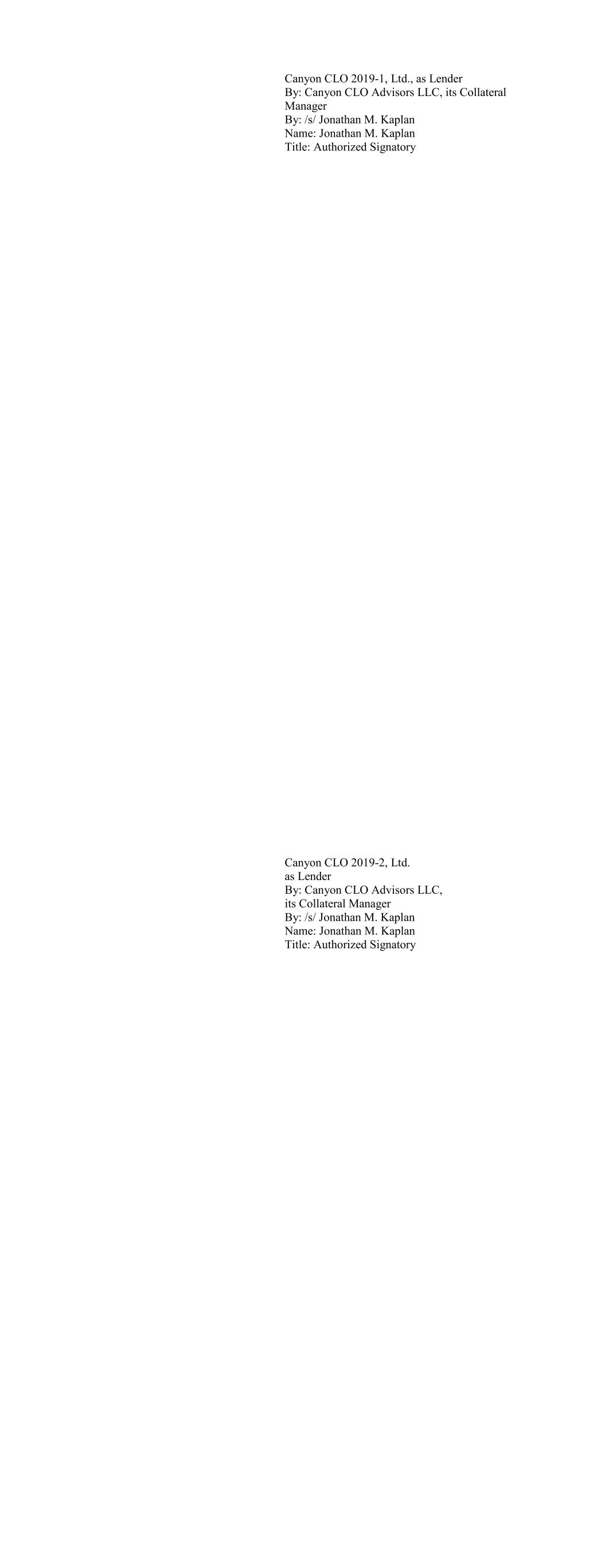 Canyon CLO 2019-1, Ltd., as Lender By: Canyon CLO Advisors LLC, its Collateral Manager By: /s/ Jonathan M. Kaplan Name: Jonathan M. Kaplan Title: Authorized Signatory Canyon CLO 2019-2, Ltd. as Lender By: Canyon CLO Advisors LLC, its Collateral Manager By: /s/ Jonathan M. Kaplan Name: Jonathan M. Kaplan Title: Authorized Signatory
