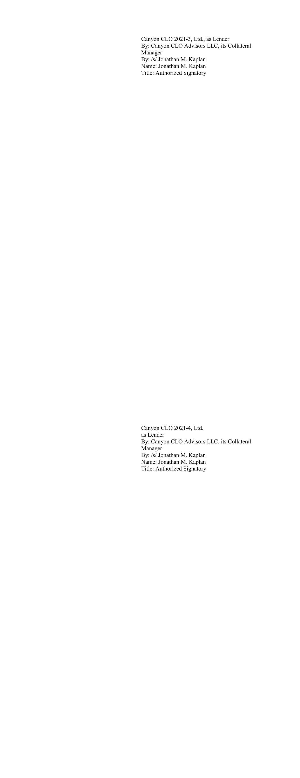 Canyon CLO 2021-3, Ltd., as Lender By: Canyon CLO Advisors LLC, its Collateral Manager By: /s/ Jonathan M. Kaplan Name: Jonathan M. Kaplan Title: Authorized Signatory Canyon CLO 2021-4, Ltd. as Lender By: Canyon CLO Advisors LLC, its Collateral Manager By: /s/ Jonathan M. Kaplan Name: Jonathan M. Kaplan Title: Authorized Signatory