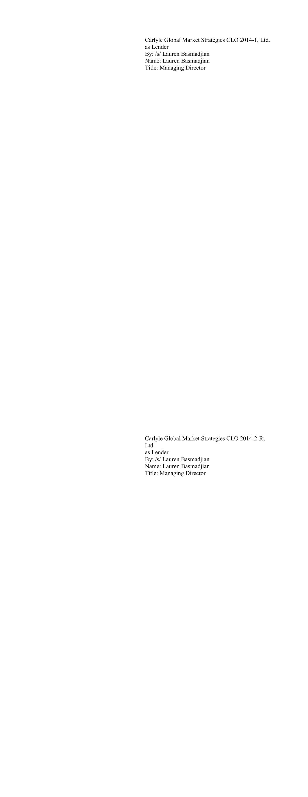 Carlyle Global Market Strategies CLO 2014-1, Ltd. as Lender By: /s/ Lauren Basmadjian Name: Lauren Basmadjian Title: Managing Director Carlyle Global Market Strategies CLO 2014-2-R, Ltd. as Lender By: /s/ Lauren Basmadjian Name: Lauren Basmadjian Title: Managing Director
