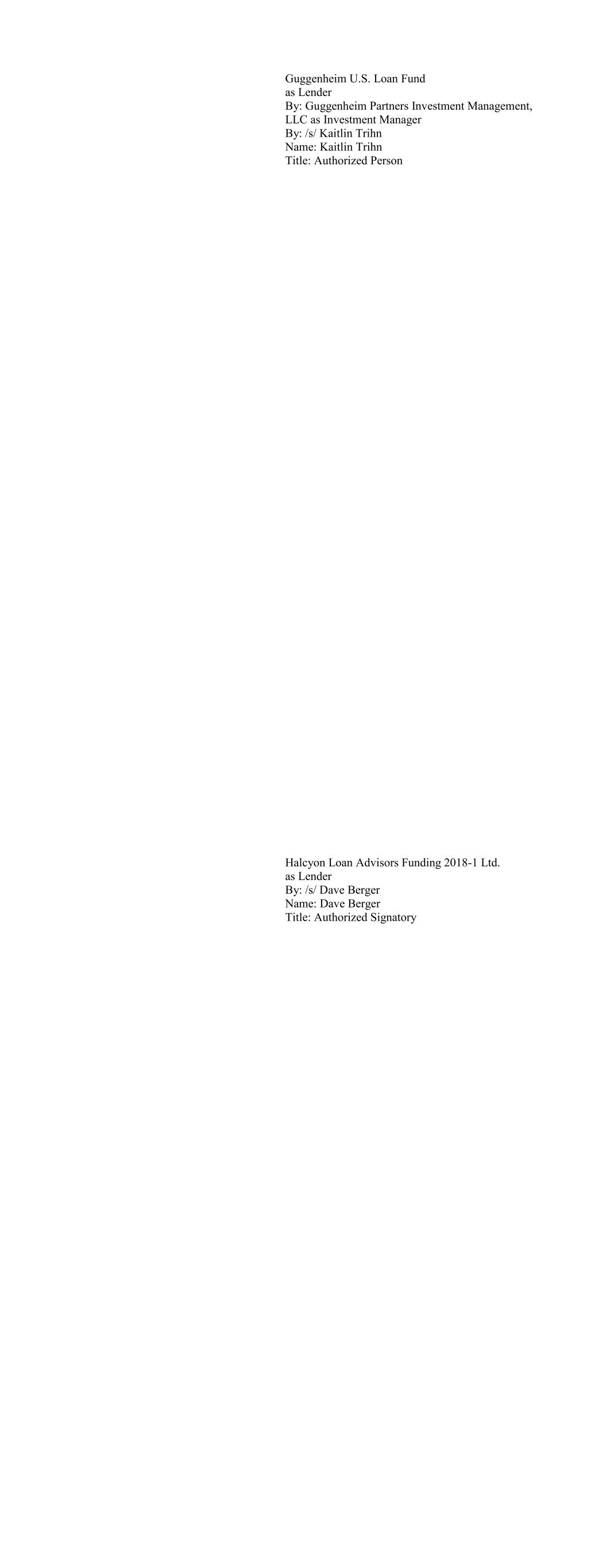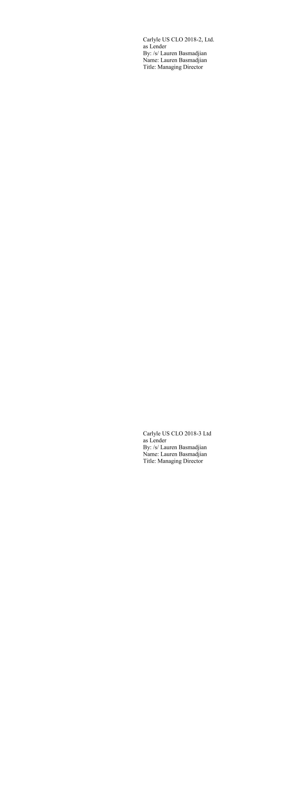 Carlyle US CLO 2018-2, Ltd. as Lender By: /s/ Lauren Basmadjian Name: Lauren Basmadjian Title: Managing Director Carlyle US CLO 2018-3 Ltd as Lender By: /s/ Lauren Basmadjian Name: Lauren Basmadjian Title: Managing Director