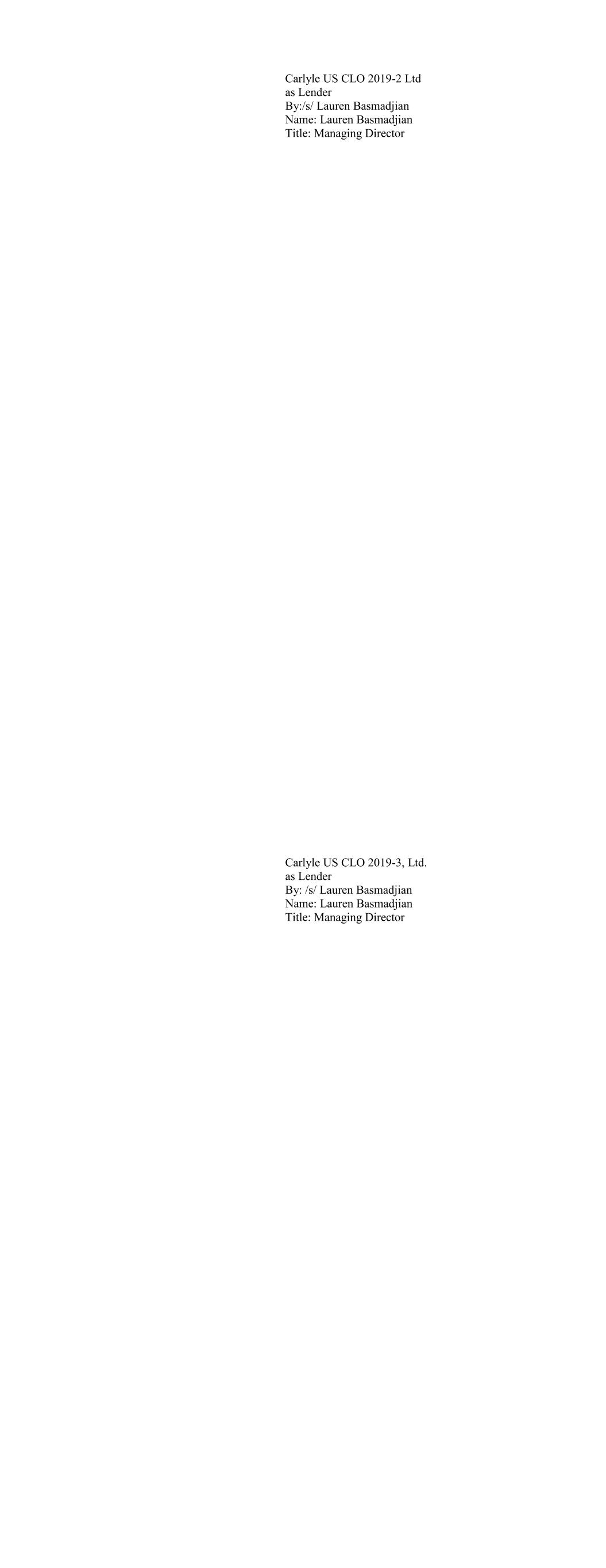 Carlyle US CLO 2019-2 Ltd as Lender By:/s/ Lauren Basmadjian Name: Lauren Basmadjian Title: Managing Director Carlyle US CLO 2019-3, Ltd. as Lender By: /s/ Lauren Basmadjian Name: Lauren Basmadjian Title: Managing Director