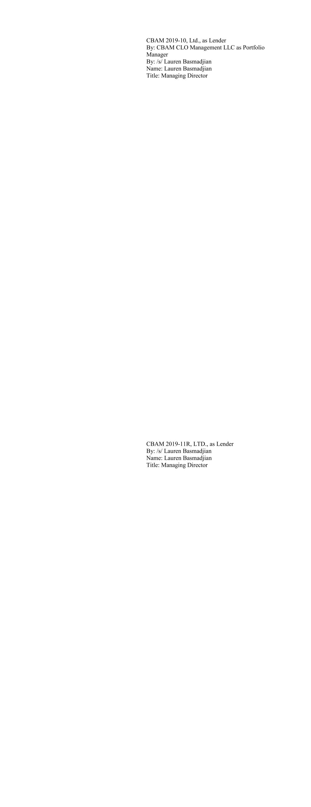 CBAM 2019-10, Ltd., as Lender By: CBAM CLO Management LLC as Portfolio Manager By: /s/ Lauren Basmadjian Name: Lauren Basmadjian Title: Managing Director CBAM 2019-11R, LTD., as Lender By: /s/ Lauren Basmadjian Name: Lauren Basmadjian Title: Managing Director