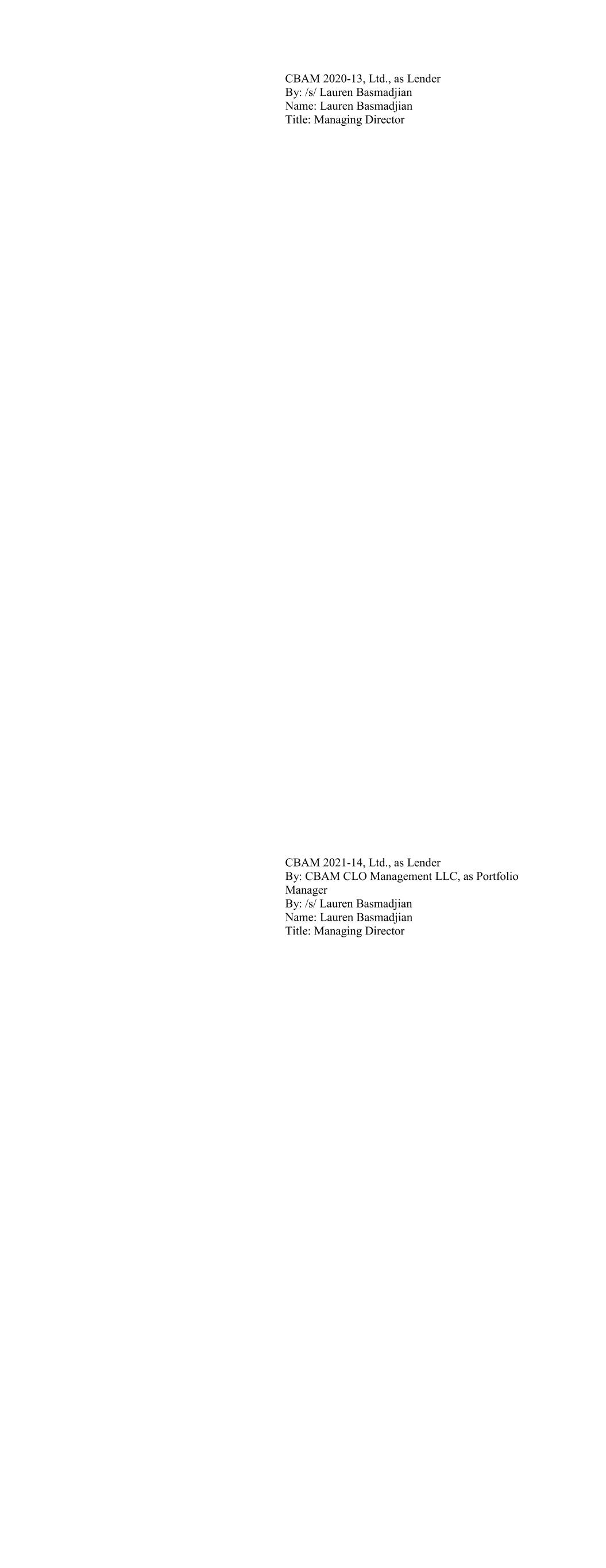 CBAM 2020-13, Ltd., as Lender By: /s/ Lauren Basmadjian Name: Lauren Basmadjian Title: Managing Director CBAM 2021-14, Ltd., as Lender By: CBAM CLO Management LLC, as Portfolio Manager By: /s/ Lauren Basmadjian Name: Lauren Basmadjian Title: Managing Director