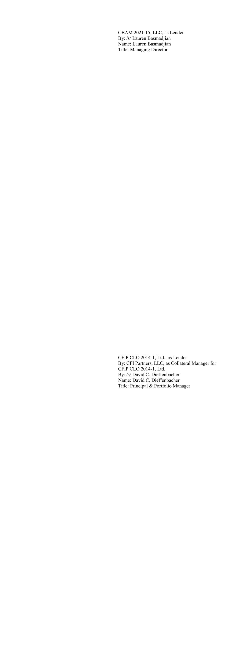 CBAM 2021-15, LLC, as Lender By: /s/ Lauren Basmadjian Name: Lauren Basmadjian Title: Managing Director CFIP CLO 2014-1, Ltd., as Lender By: CFI Partners, LLC, as Collateral Manager for CFIP CLO 2014-1, Ltd. By: /s/ David C. Dieffenbacher Name: David C. Dieffenbacher Title: Principal & Portfolio Manager