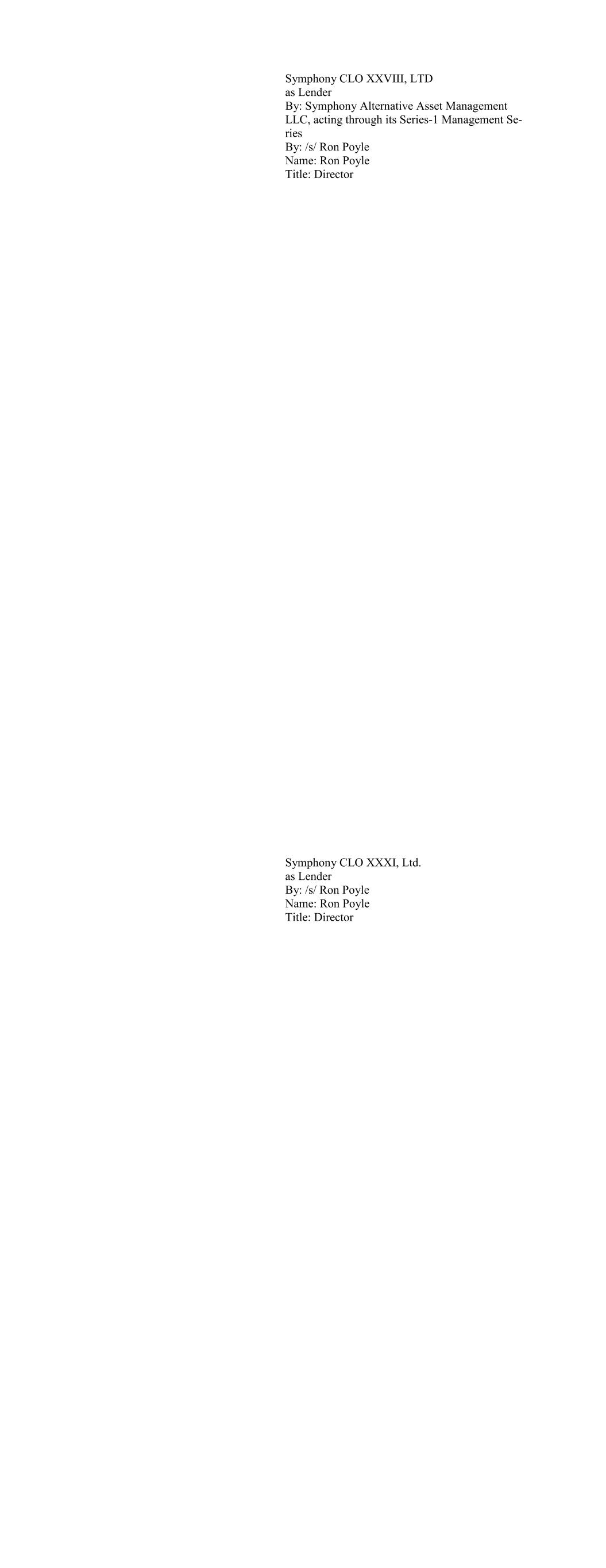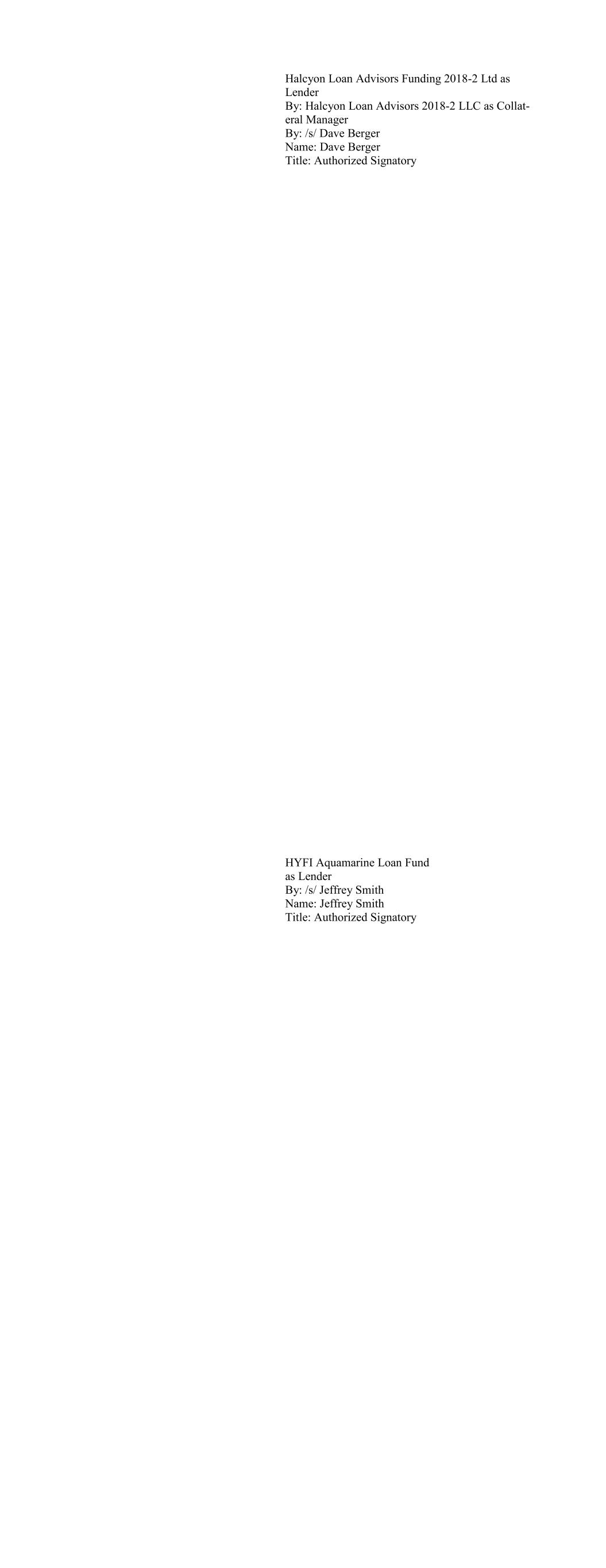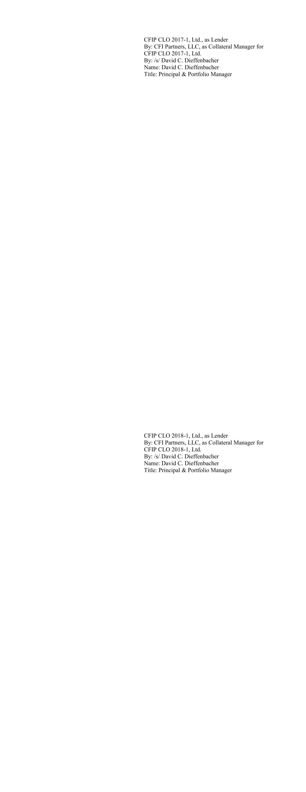 CFIP CLO 2017-1, Ltd., as Lender By: CFI Partners, LLC, as Collateral Manager for CFIP CLO 2017-1, Ltd. By: /s/ David C. Dieffenbacher Name: David C. Dieffenbacher Title: Principal & Portfolio Manager CFIP CLO 2018-1, Ltd., as Lender By: CFI Partners, LLC, as Collateral Manager for CFIP CLO 2018-1, Ltd. By: /s/ David C. Dieffenbacher Name: David C. Dieffenbacher Title: Principal & Portfolio Manager