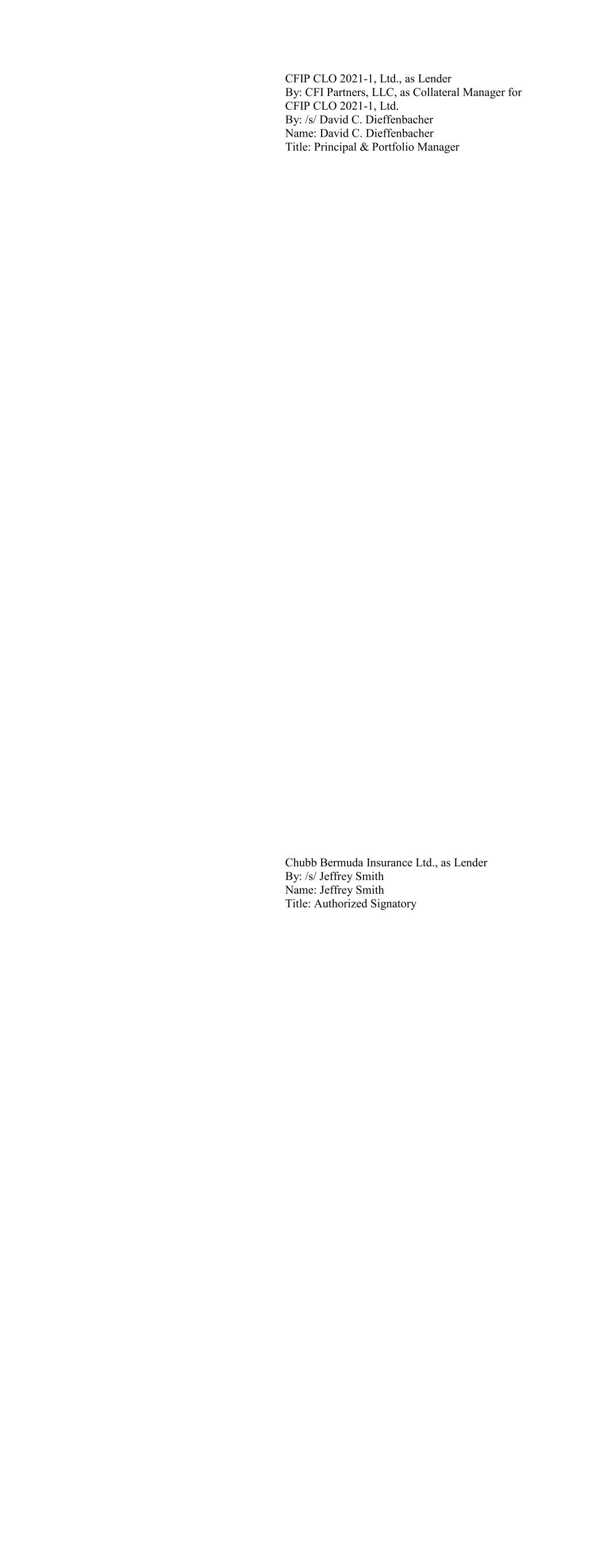 CFIP CLO 2021-1, Ltd., as Lender By: CFI Partners, LLC, as Collateral Manager for CFIP CLO 2021-1, Ltd. By: /s/ David C. Dieffenbacher Name: David C. Dieffenbacher Title: Principal & Portfolio Manager Chubb Bermuda Insurance Ltd., as Lender By: /s/ Jeffrey Smith Name: Jeffrey Smith Title: Authorized Signatory