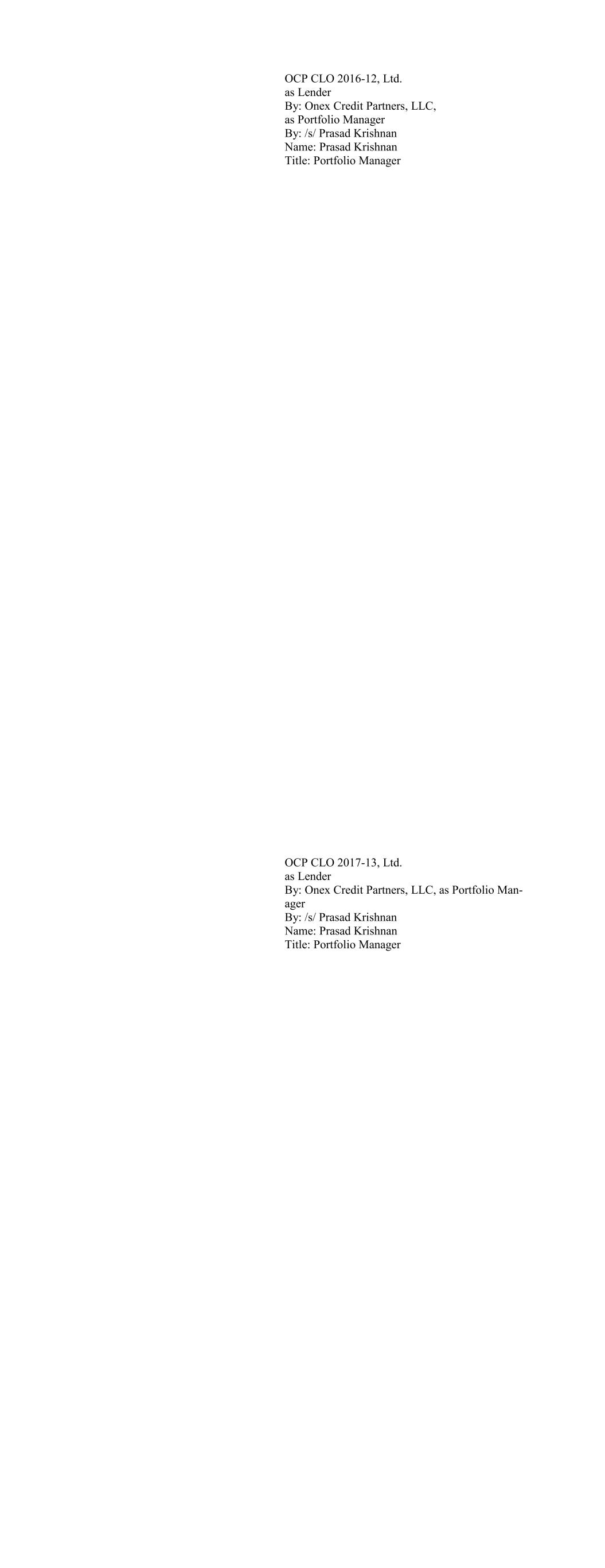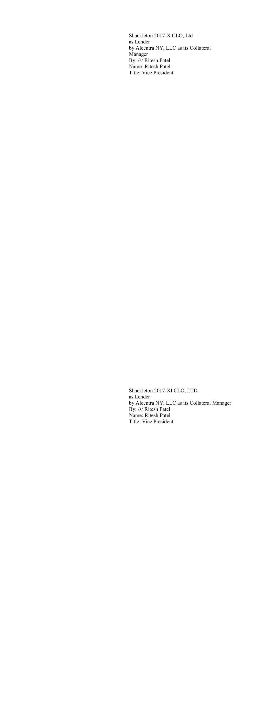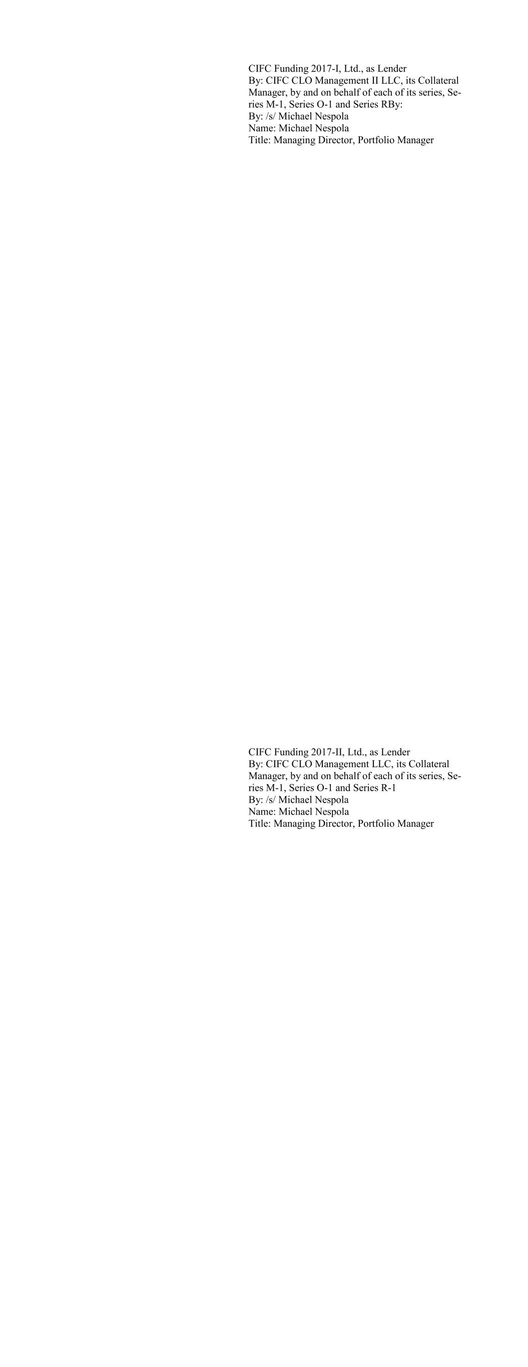CIFC Funding 2017-I, Ltd., as Lender By: CIFC CLO Management II LLC, its Collateral Manager, by and on behalf of each of its series, Se- ries M-1, Series O-1 and Series RBy: By: /s/ Michael Nespola Name: Michael Nespola Title: Managing Director, Portfolio Manager CIFC Funding 2017-II, Ltd., as Lender By: CIFC CLO Management LLC, its Collateral Manager, by and on behalf of each of its series, Se- ries M-1, Series O-1 and Series R-1 By: /s/ Michael Nespola Name: Michael Nespola Title: Managing Director, Portfolio Manager