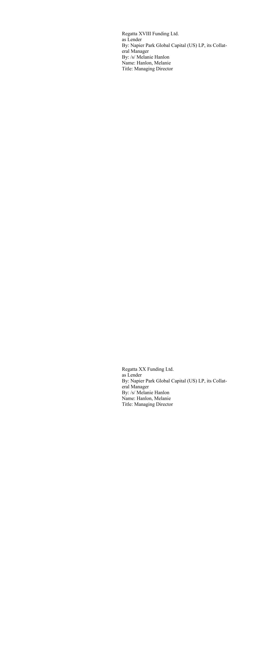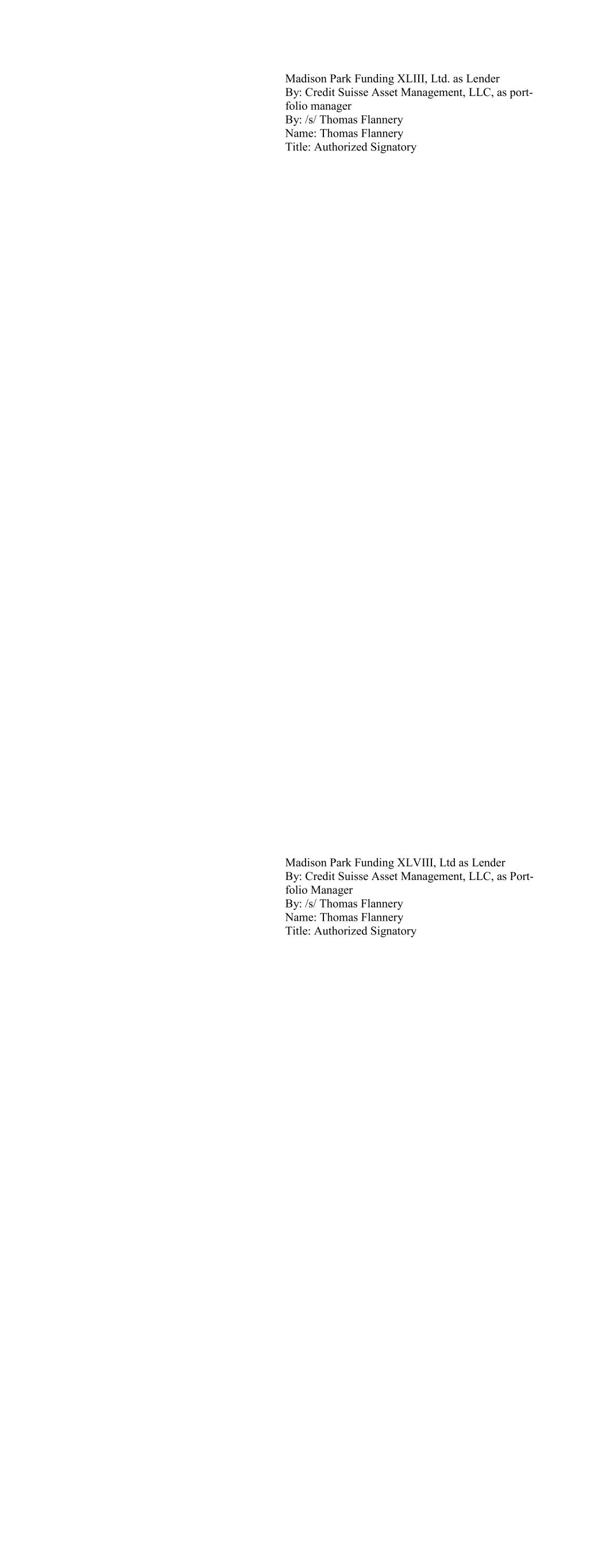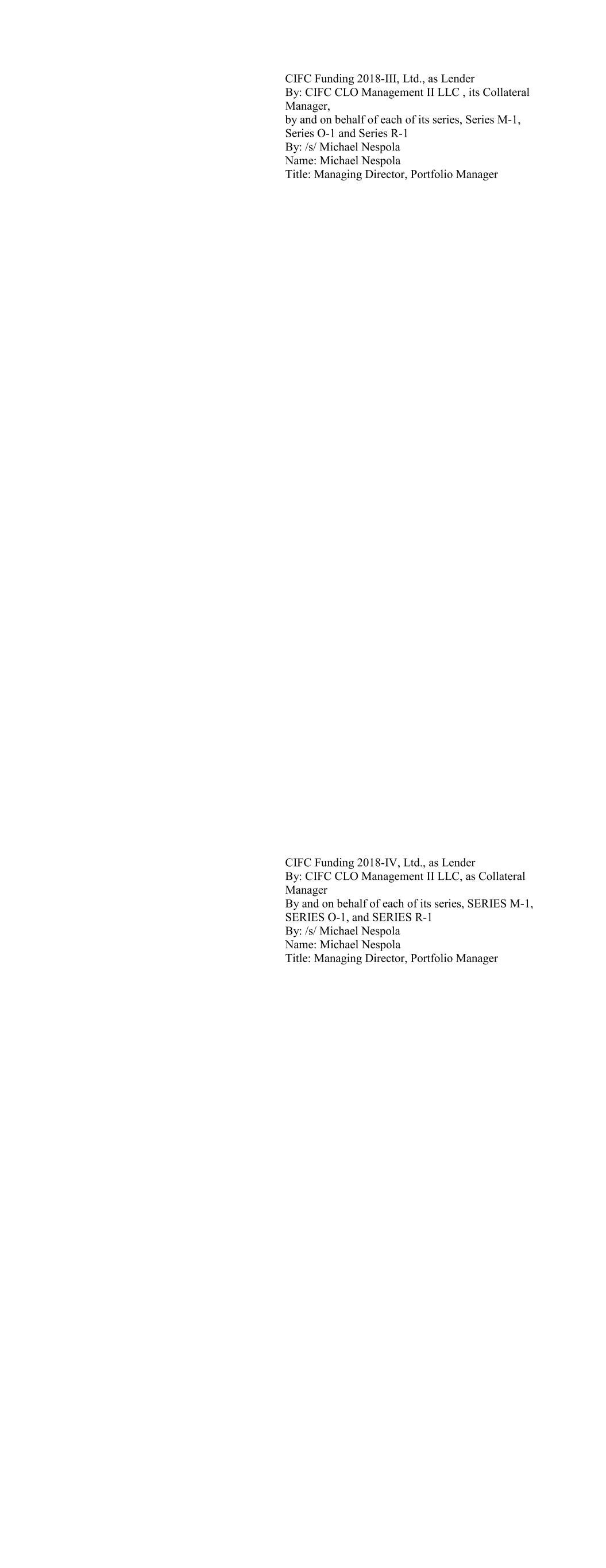 CIFC Funding 2018-III, Ltd., as Lender By: CIFC CLO Management II LLC , its Collateral Manager, by and on behalf of each of its series, Series M-1, Series O-1 and Series R-1 By: /s/ Michael Nespola Name: Michael Nespola Title: Managing Director, Portfolio Manager CIFC Funding 2018-IV, Ltd., as Lender By: CIFC CLO Management II LLC, as Collateral Manager By and on behalf of each of its series, SERIES M-1, SERIES O-1, and SERIES R-1 By: /s/ Michael Nespola Name: Michael Nespola Title: Managing Director, Portfolio Manager
