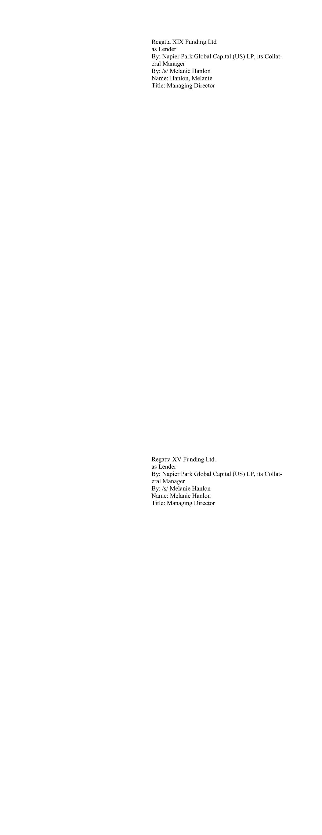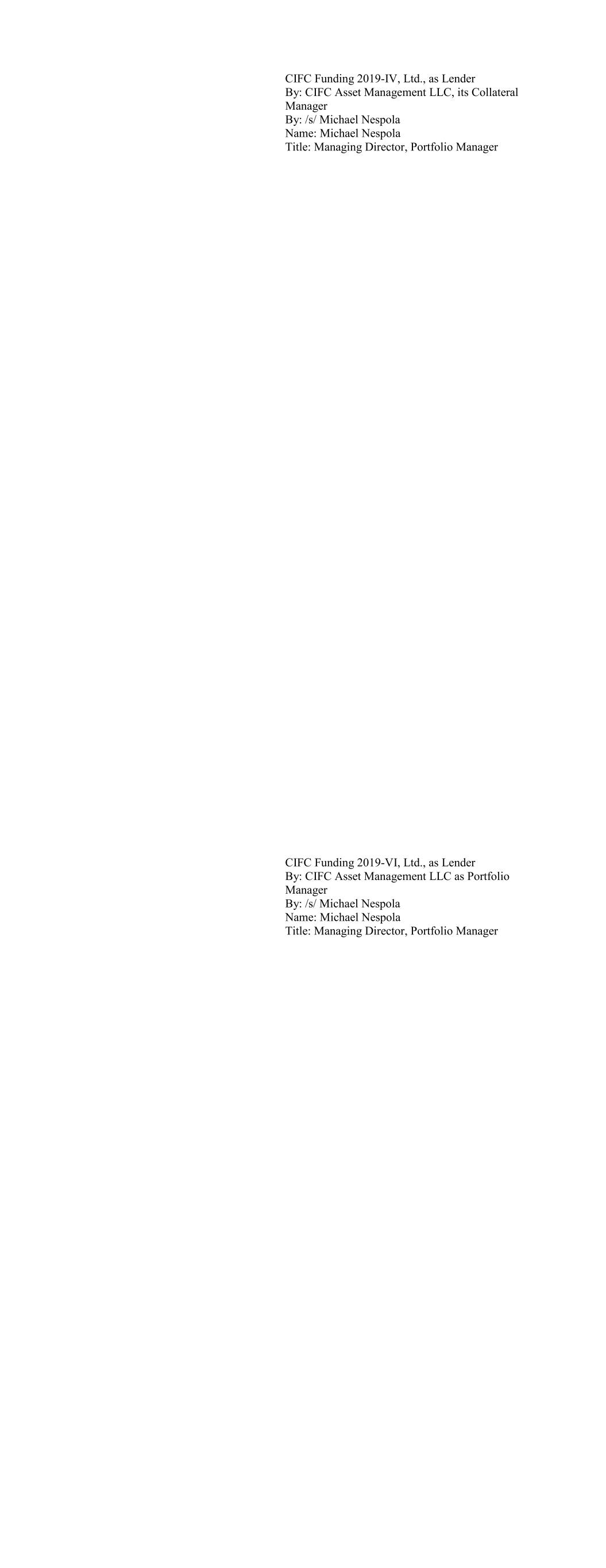 CIFC Funding 2019-IV, Ltd., as Lender By: CIFC Asset Management LLC, its Collateral Manager By: /s/ Michael Nespola Name: Michael Nespola Title: Managing Director, Portfolio Manager CIFC Funding 2019-VI, Ltd., as Lender By: CIFC Asset Management LLC as Portfolio Manager By: /s/ Michael Nespola Name: Michael Nespola Title: Managing Director, Portfolio Manager