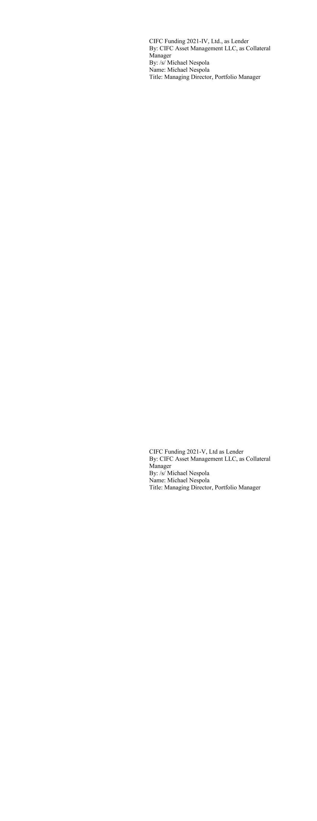 CIFC Funding 2021-IV, Ltd., as Lender By: CIFC Asset Management LLC, as Collateral Manager By: /s/ Michael Nespola Name: Michael Nespola Title: Managing Director, Portfolio Manager CIFC Funding 2021-V, Ltd as Lender By: CIFC Asset Management LLC, as Collateral Manager By: /s/ Michael Nespola Name: Michael Nespola Title: Managing Director, Portfolio Manager
