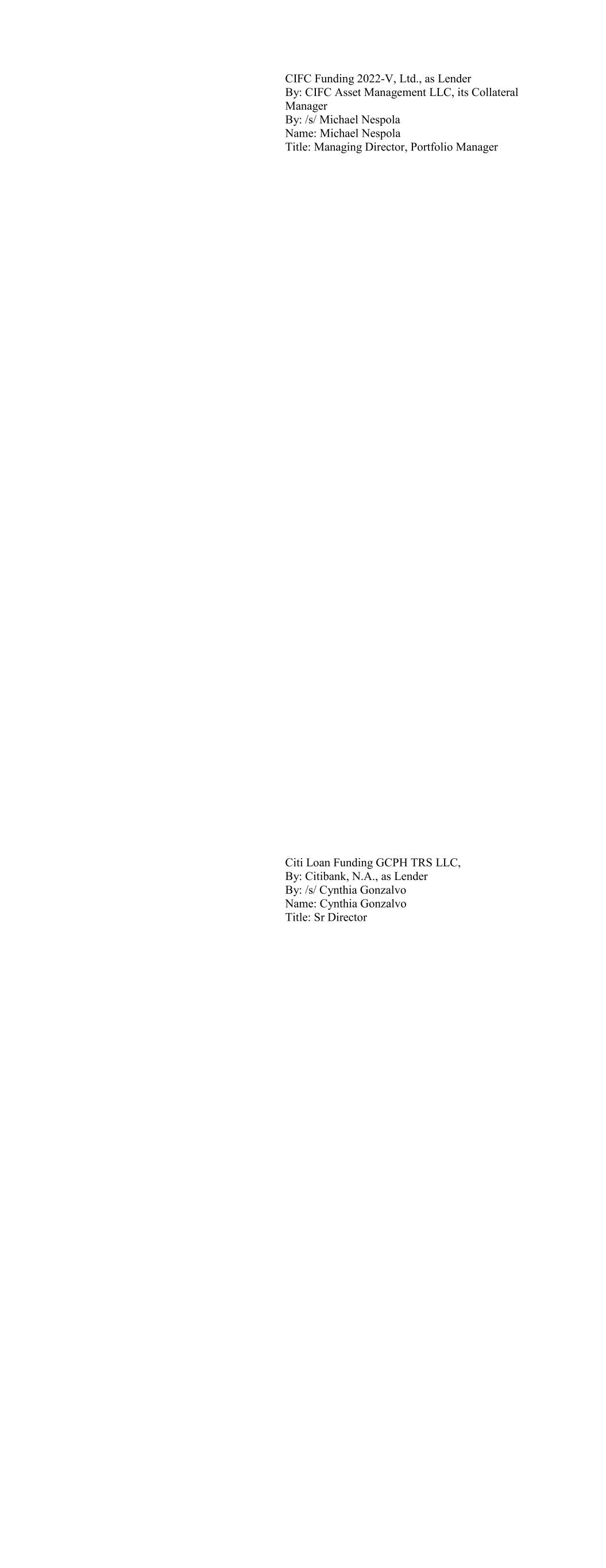 CIFC Funding 2022-V, Ltd., as Lender By: CIFC Asset Management LLC, its Collateral Manager By: /s/ Michael Nespola Name: Michael Nespola Title: Managing Director, Portfolio Manager Citi Loan Funding GCPH TRS LLC, By: Citibank, N.A., as Lender By: /s/ Cynthia Gonzalvo Name: Cynthia Gonzalvo Title: Sr Director