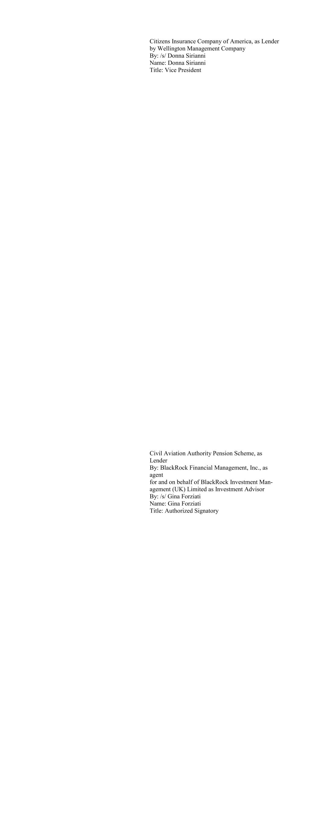 Citizens Insurance Company of America, as Lender by Wellington Management Company By: /s/ Donna Sirianni Name: Donna Sirianni Title: Vice President Civil Aviation Authority Pension Scheme, as Lender By: BlackRock Financial Management, Inc., as agent for and on behalf of BlackRock Investment Man- agement (UK) Limited as Investment Advisor By: /s/ Gina Forziati Name: Gina Forziati Title: Authorized Signatory