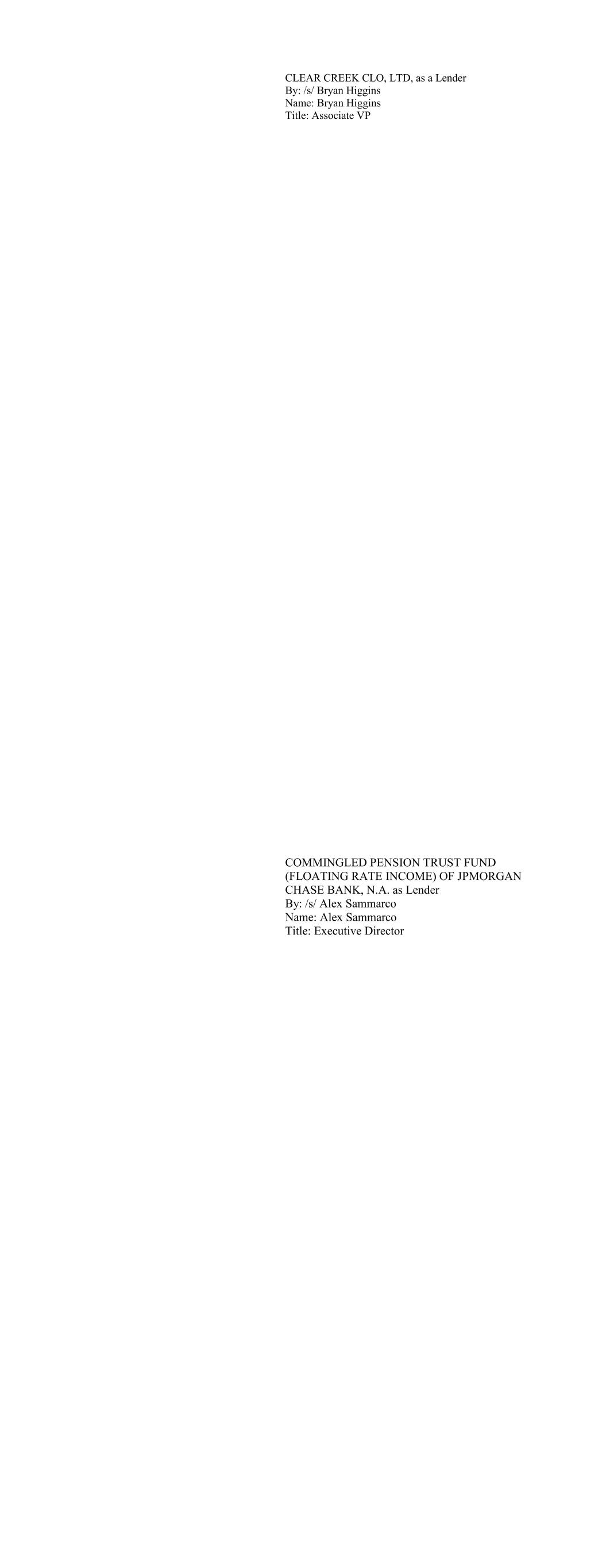 CLEAR CREEK CLO, LTD, as a Lender By: /s/ Bryan Higgins Name: Bryan Higgins Title: Associate VP COMMINGLED PENSION TRUST FUND (FLOATING RATE INCOME) OF JPMORGAN CHASE BANK, N.A. as Lender By: /s/ Alex Sammarco Name: Alex Sammarco Title: Executive Director