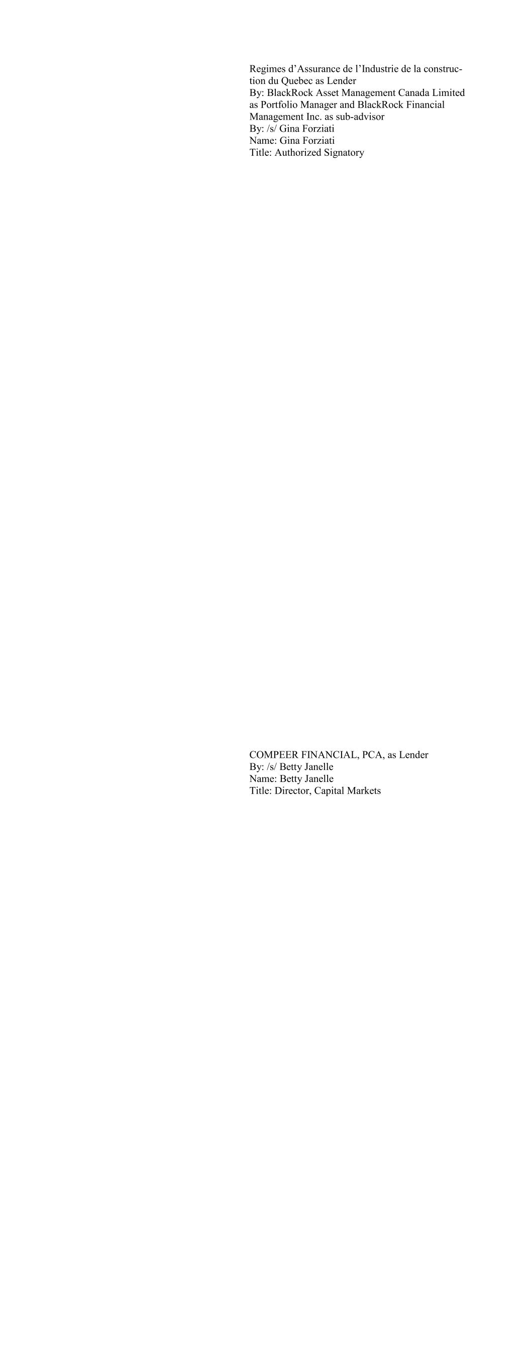 Regimes d’Assurance de l’Industrie de la construc- tion du Quebec as Lender By: BlackRock Asset Management Canada Limited as Portfolio Manager and BlackRock Financial Management Inc. as sub-advisor By: /s/ Gina Forziati Name: Gina Forziati Title: Authorized Signatory COMPEER FINANCIAL, PCA, as Lender By: /s/ Betty Janelle Name: Betty Janelle Title: Director, Capital Markets