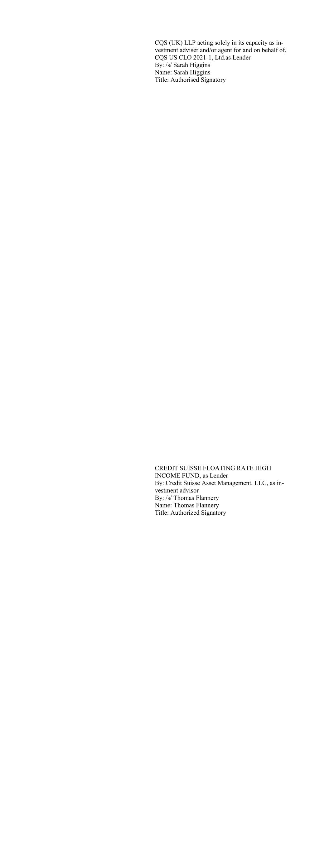 CQS (UK) LLP acting solely in its capacity as in- vestment adviser and/or agent for and on behalf of, CQS US CLO 2021-1, Ltd.as Lender By: /s/ Sarah Higgins Name: Sarah Higgins Title: Authorised Signatory CREDIT SUISSE FLOATING RATE HIGH INCOME FUND, as Lender By: Credit Suisse Asset Management, LLC, as in- vestment advisor By: /s/ Thomas Flannery Name: Thomas Flannery Title: Authorized Signatory