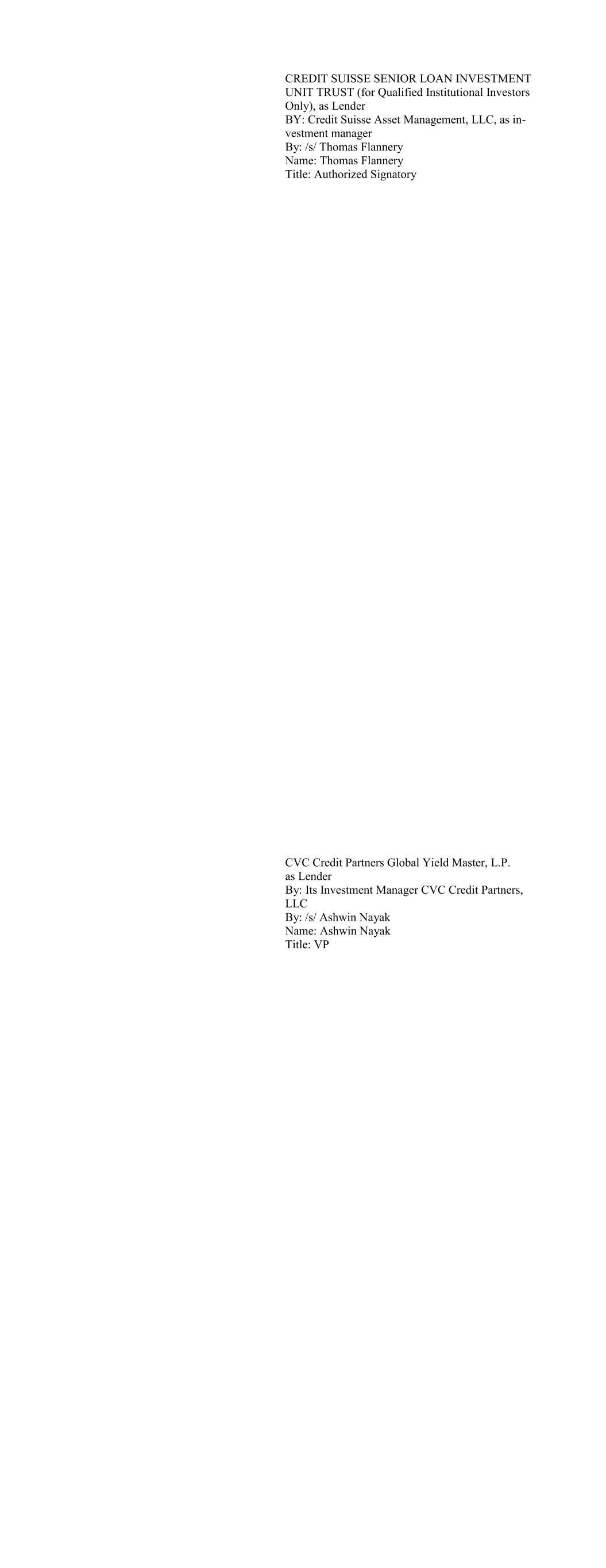 CREDIT SUISSE SENIOR LOAN INVESTMENT UNIT TRUST (for Qualified Institutional Investors Only), as Lender BY: Credit Suisse Asset Management, LLC, as in- vestment manager By: /s/ Thomas Flannery Name: Thomas Flannery Title: Authorized Signatory CVC Credit Partners Global Yield Master, L.P. as Lender By: Its Investment Manager CVC Credit Partners, LLC By: /s/ Ashwin Nayak Name: Ashwin Nayak Title: VP