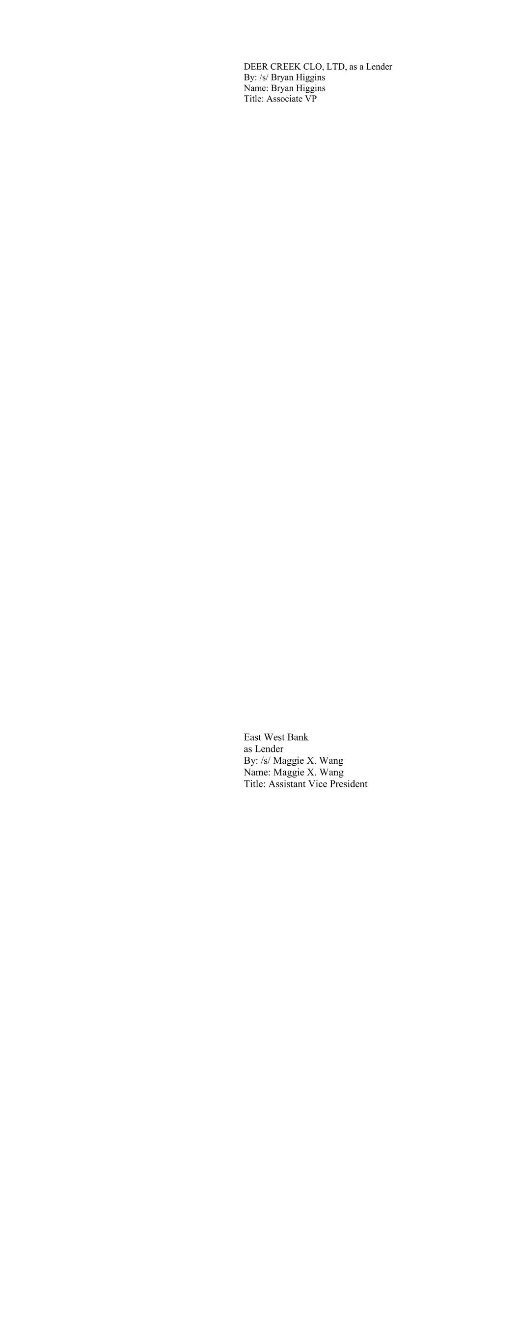 DEER CREEK CLO, LTD, as a Lender By: /s/ Bryan Higgins Name: Bryan Higgins Title: Associate VP East West Bank as Lender By: /s/ Maggie X. Wang Name: Maggie X. Wang Title: Assistant Vice President