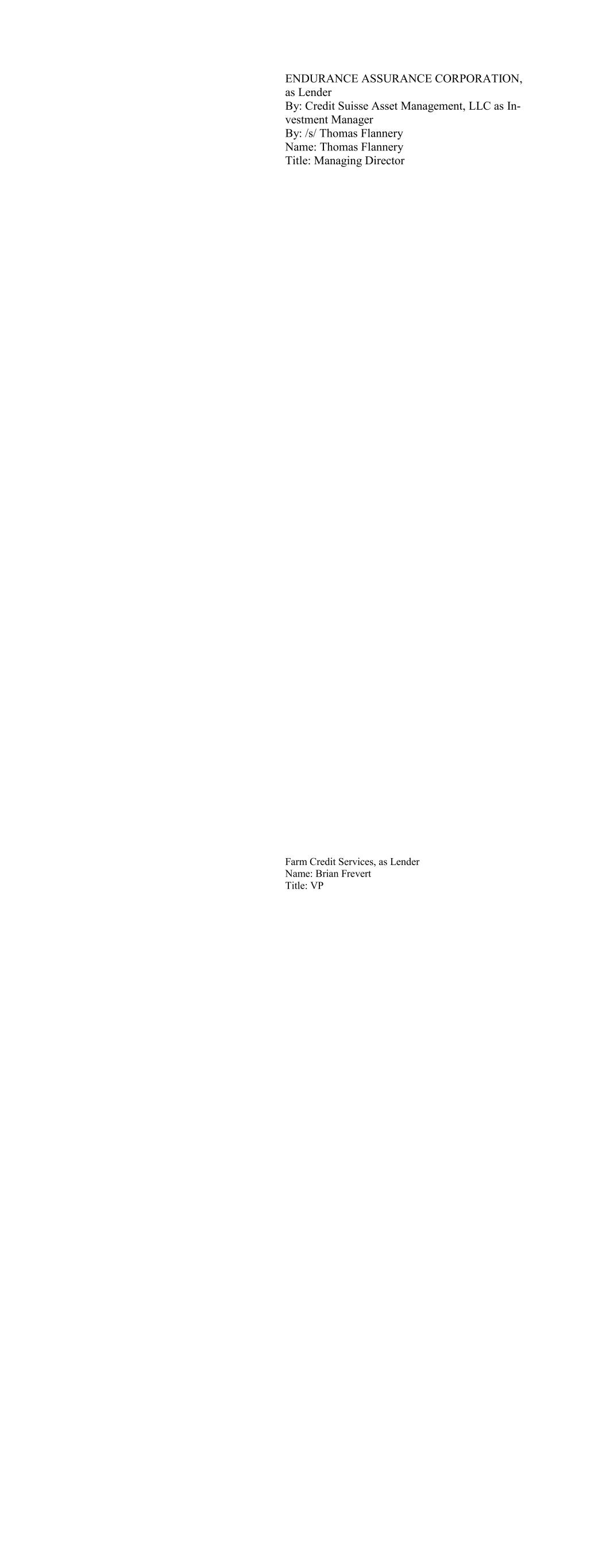 ENDURANCE ASSURANCE CORPORATION, as Lender By: Credit Suisse Asset Management, LLC as In- vestment Manager By: /s/ Thomas Flannery Name: Thomas Flannery Title: Managing Director Farm Credit Services, as Lender Name: Brian Frevert Title: VP