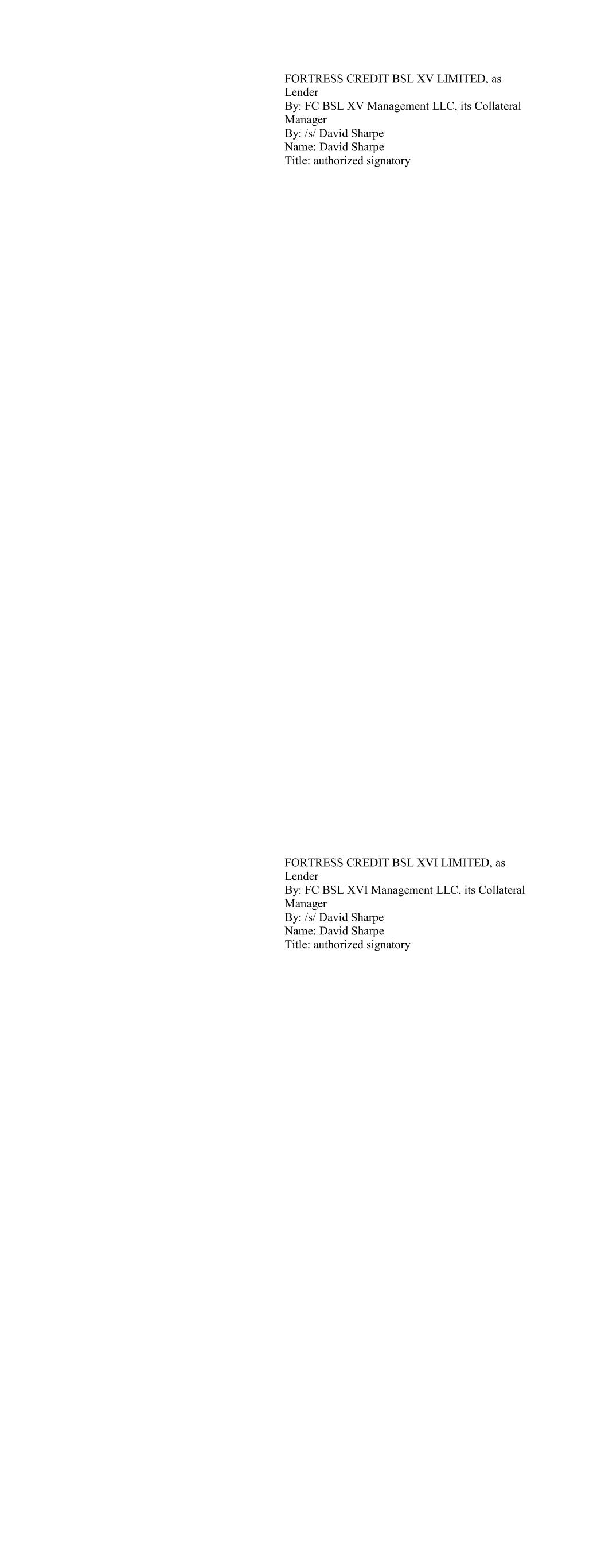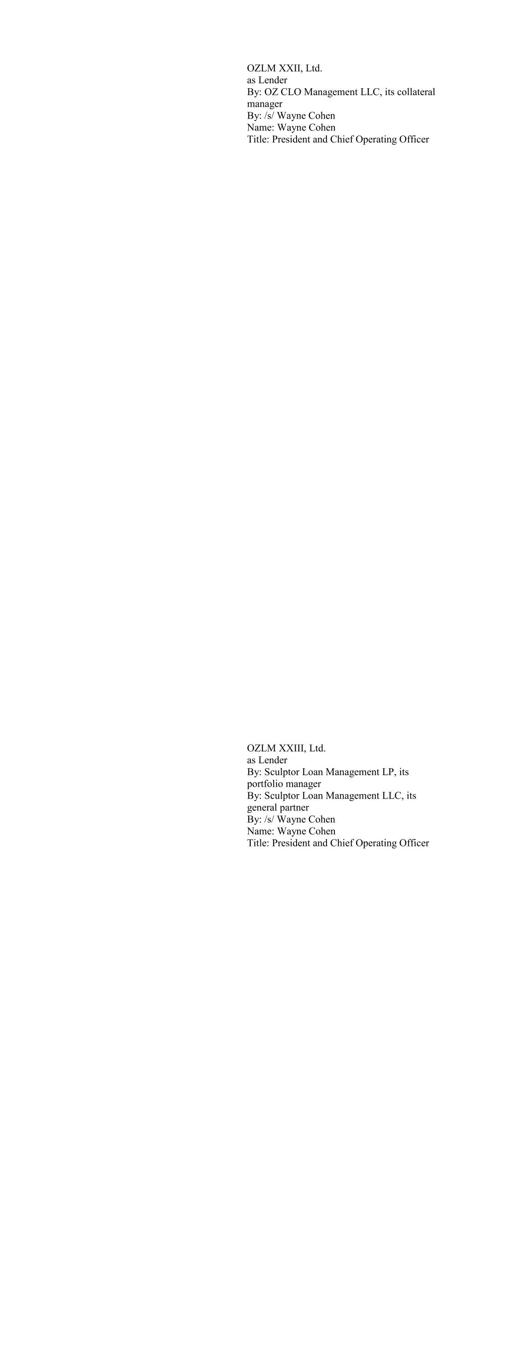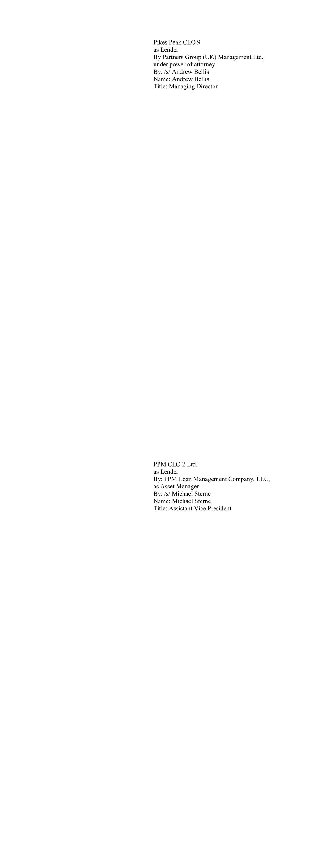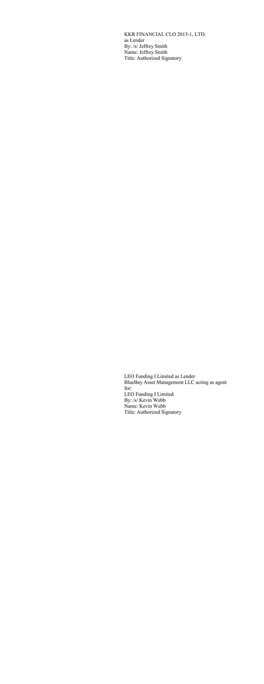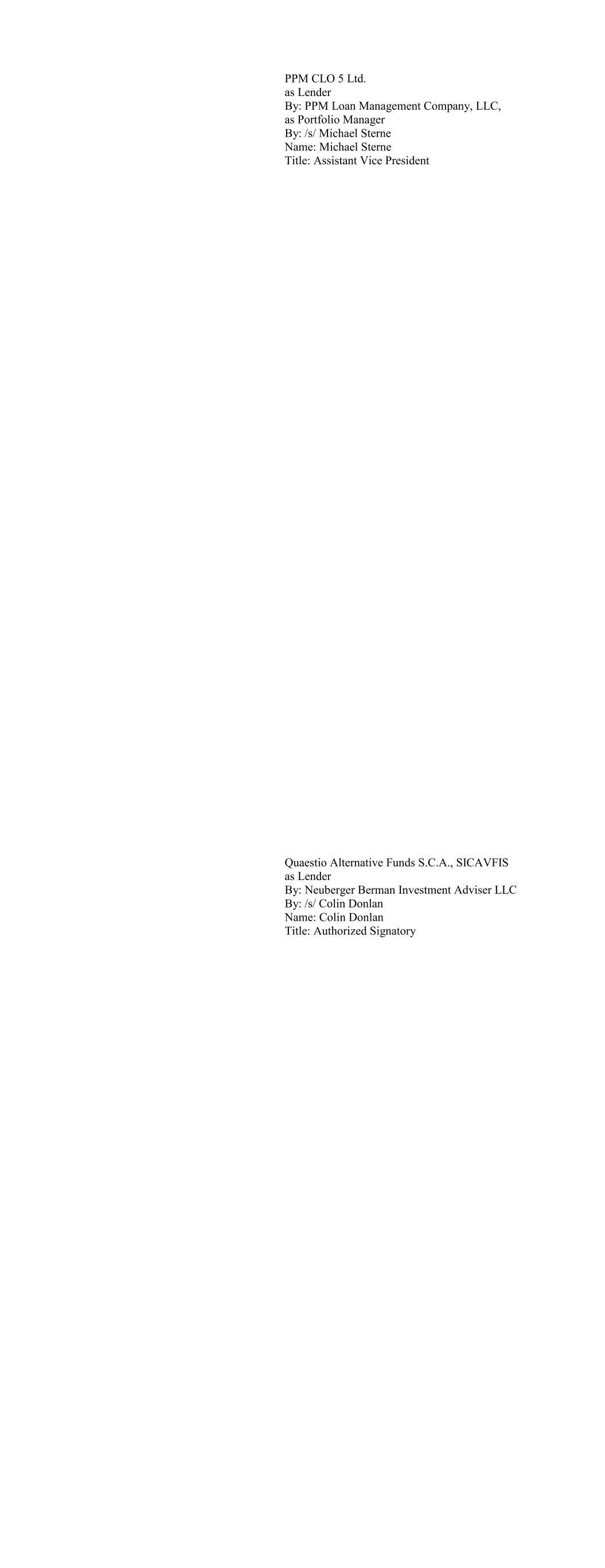BBAM US CLO I, LTD as Lender BlueBay Asset Management USA LLC acting as agent for: BBAM US CLO I, Ltd. By: /s/ Kevin Webb Name: Kevin Webb Title: Authorized Signatory BBAM US CLO II, Ltd as Lender BlueBay Asset Management USA LLC acting as agent for: BBAM US CLO II, Ltd By: /s/ Kevin Webb Name: Kevin Webb Title: Authorized Signatory