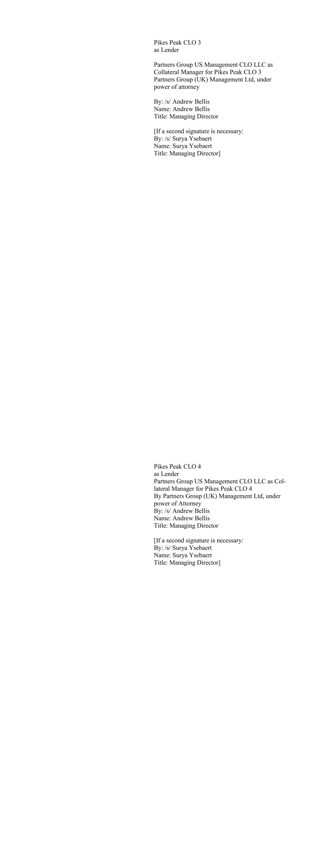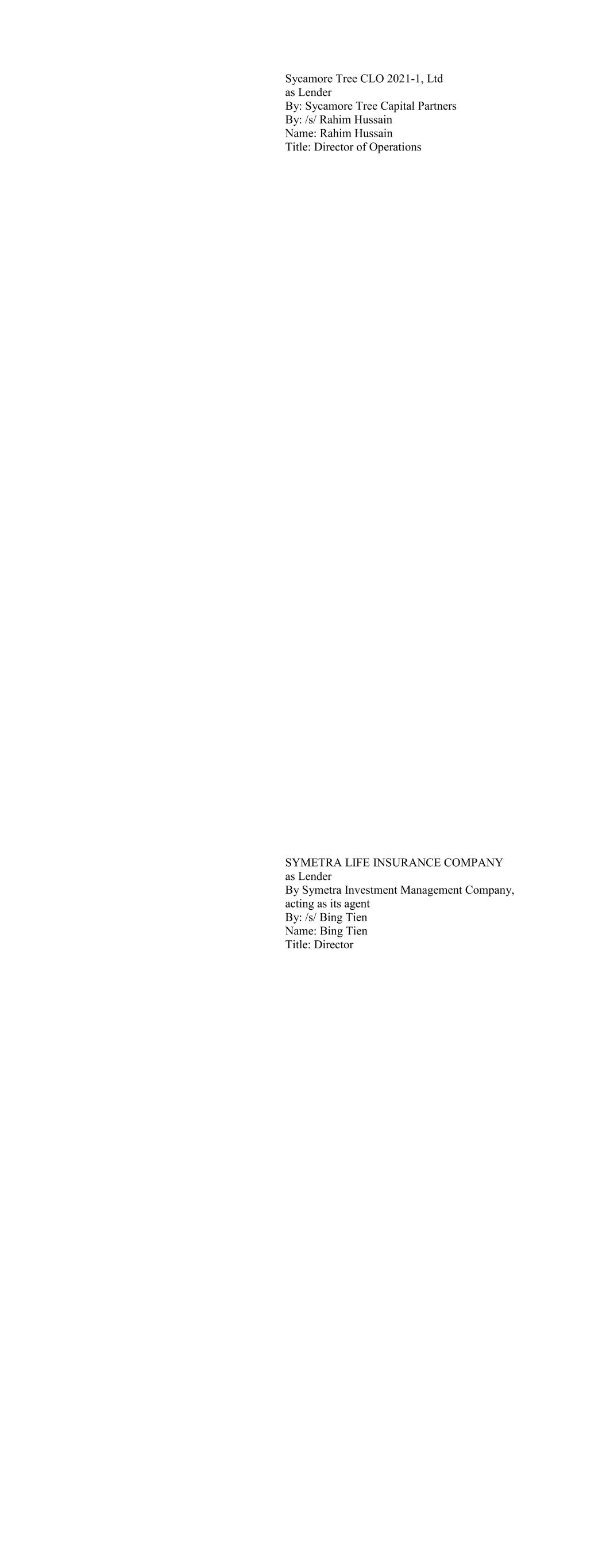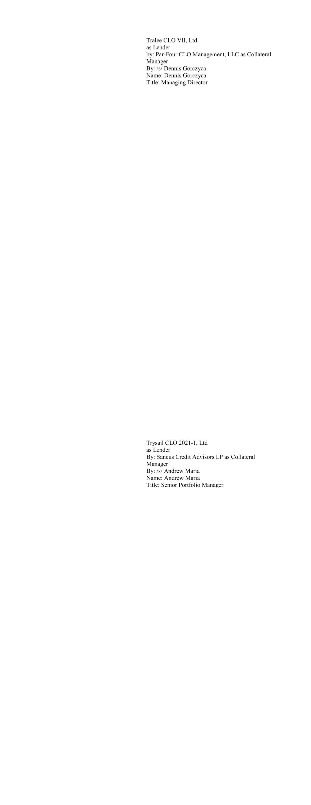 Tralee CLO VII, Ltd. as Lender by: Par-Four CLO Management, LLC as Collateral Manager By: /s/ Dennis Gorczyca Name: Dennis Gorczyca Title: Managing Director Trysail CLO 2021-1, Ltd as Lender By: Sancus Credit Advisors LP as Collateral Manager By: /s/ Andrew Maria Name: Andrew Maria Title: Senior Portfolio Manager
