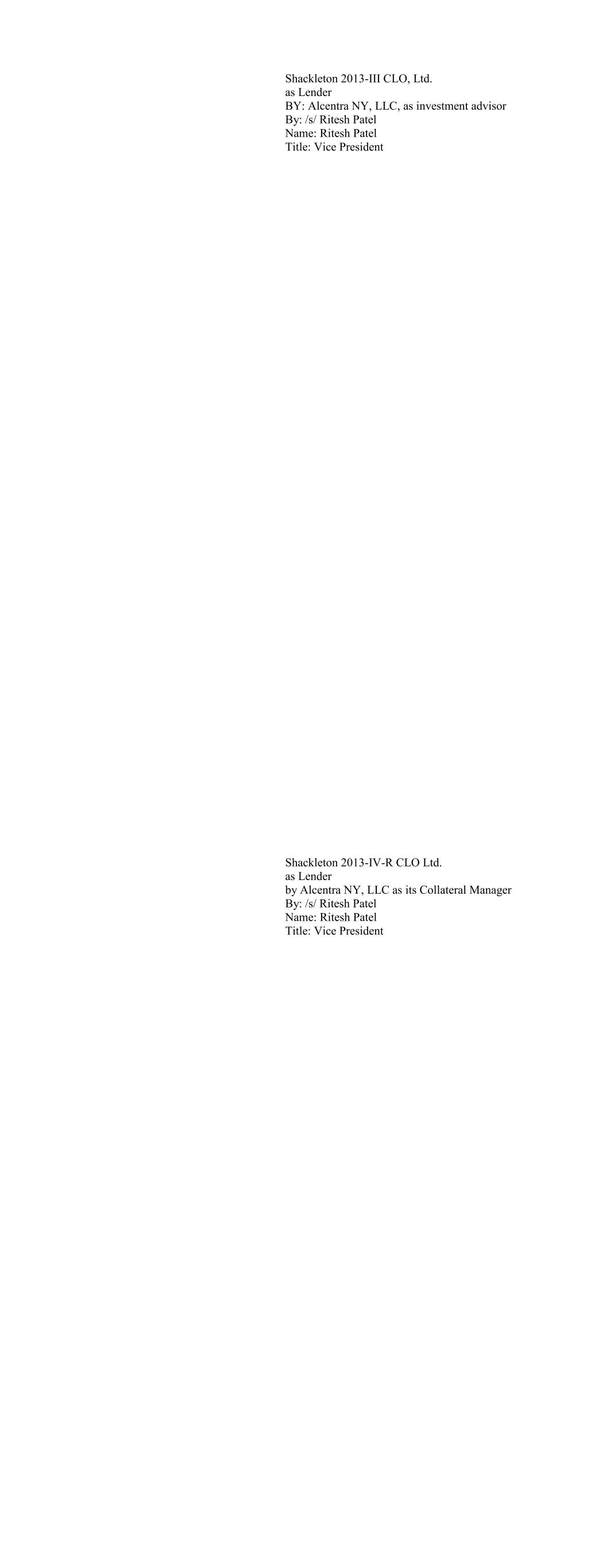 CIFC Funding 2013-IV, Ltd., as Lender By: CIFC Asset Management LLC, its Collateral Manager By: /s/ Michael Nespola Name: Michael Nespola Title: Managing Director, Portfolio Manager CIFC Funding 2014-IV-R, Ltd., as Lender By: CIFC Asset Management LLC, its Collateral Manager By: /s/ Michael Nespola Name: Michael Nespola Title: Managing Director, Portfolio Manager