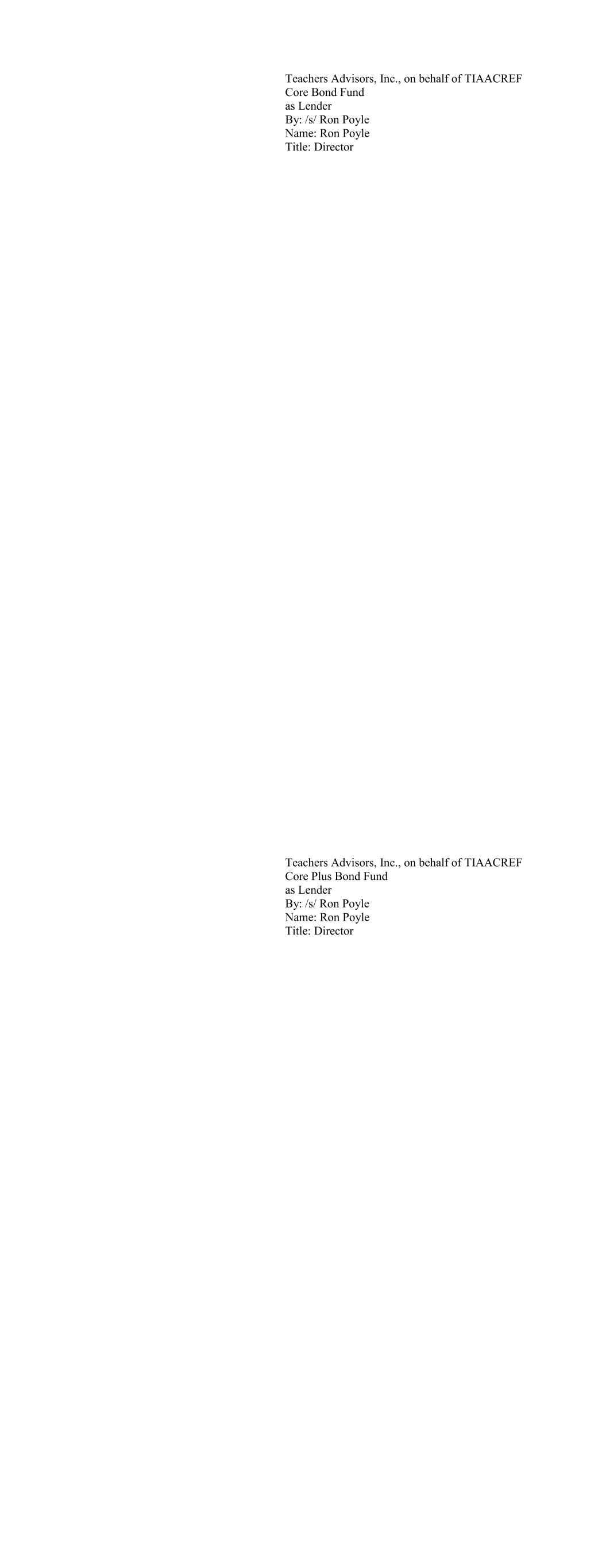 Teachers Advisors, Inc., on behalf of TIAACREF Core Bond Fund as Lender By: /s/ Ron Poyle Name: Ron Poyle Title: Director Teachers Advisors, Inc., on behalf of TIAACREF Core Plus Bond Fund as Lender By: /s/ Ron Poyle Name: Ron Poyle Title: Director