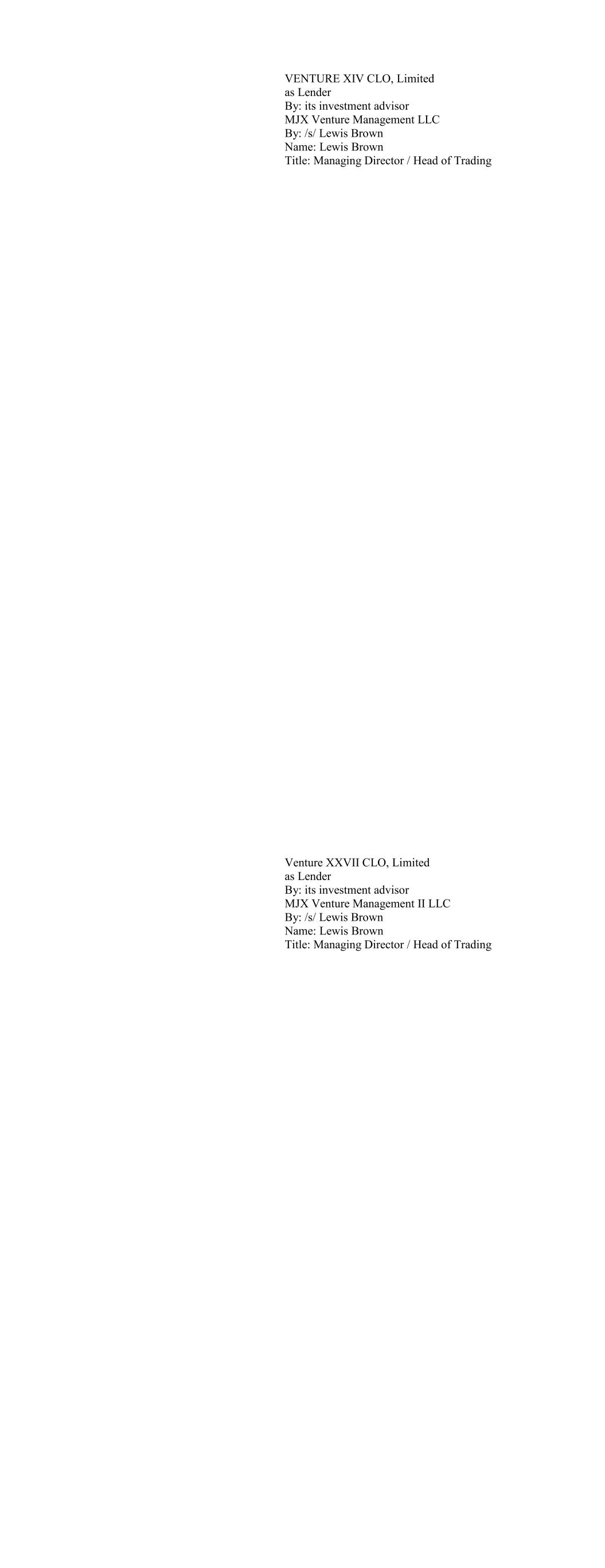 VENTURE XIV CLO, Limited as Lender By: its investment advisor MJX Venture Management LLC By: /s/ Lewis Brown Name: Lewis Brown Title: Managing Director / Head of Trading Venture XXVII CLO, Limited as Lender By: its investment advisor MJX Venture Management II LLC By: /s/ Lewis Brown Name: Lewis Brown Title: Managing Director / Head of Trading