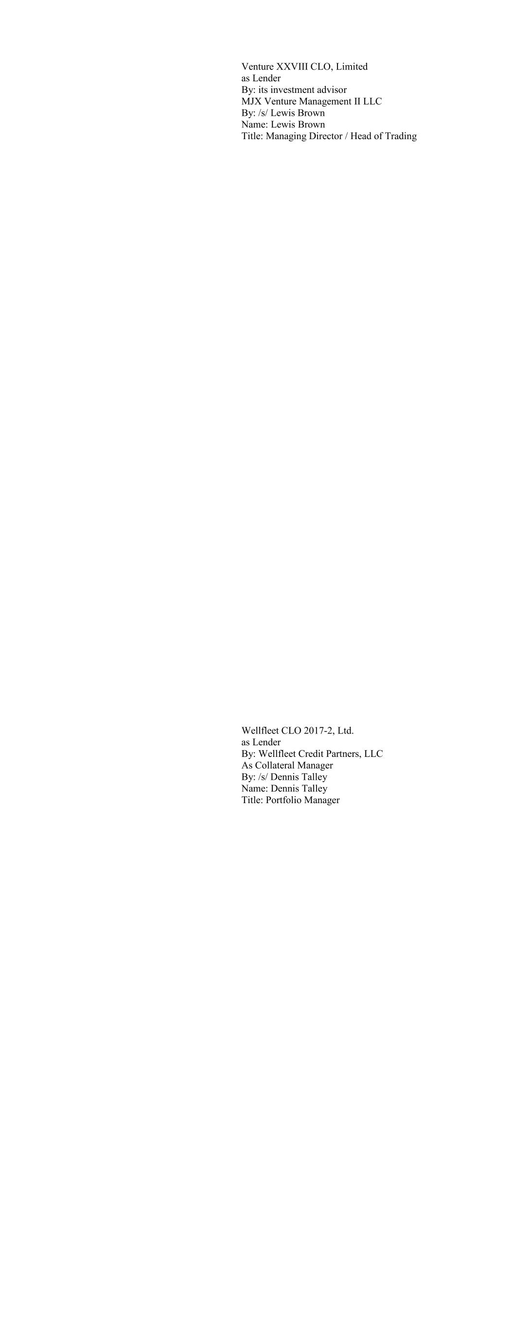 Venture XXVIII CLO, Limited as Lender By: its investment advisor MJX Venture Management II LLC By: /s/ Lewis Brown Name: Lewis Brown Title: Managing Director / Head of Trading Wellfleet CLO 2017-2, Ltd. as Lender By: Wellfleet Credit Partners, LLC As Collateral Manager By: /s/ Dennis Talley Name: Dennis Talley Title: Portfolio Manager