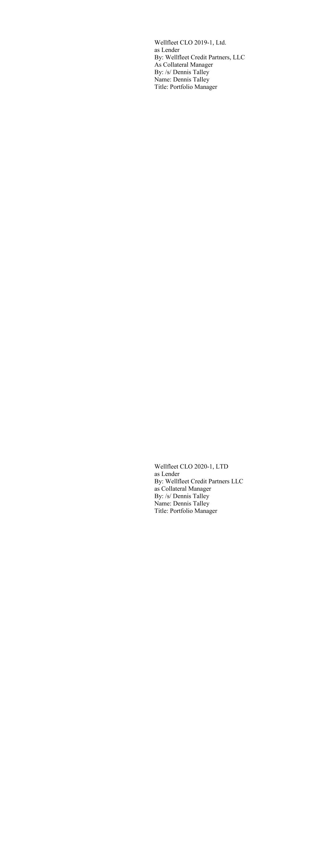 Wellfleet CLO 2019-1, Ltd. as Lender By: Wellfleet Credit Partners, LLC As Collateral Manager By: /s/ Dennis Talley Name: Dennis Talley Title: Portfolio Manager Wellfleet CLO 2020-1, LTD as Lender By: Wellfleet Credit Partners LLC as Collateral Manager By: /s/ Dennis Talley Name: Dennis Talley Title: Portfolio Manager
