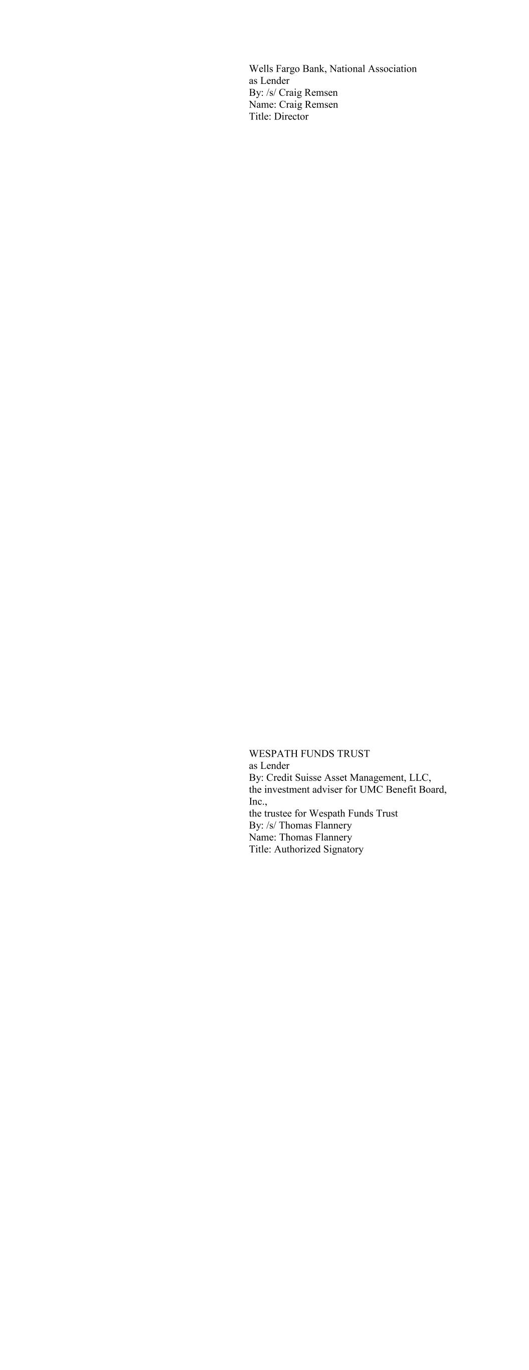 Wells Fargo Bank, National Association as Lender By: /s/ Craig Remsen Name: Craig Remsen Title: Director WESPATH FUNDS TRUST as Lender By: Credit Suisse Asset Management, LLC, the investment adviser for UMC Benefit Board, Inc., the trustee for Wespath Funds Trust By: /s/ Thomas Flannery Name: Thomas Flannery Title: Authorized Signatory