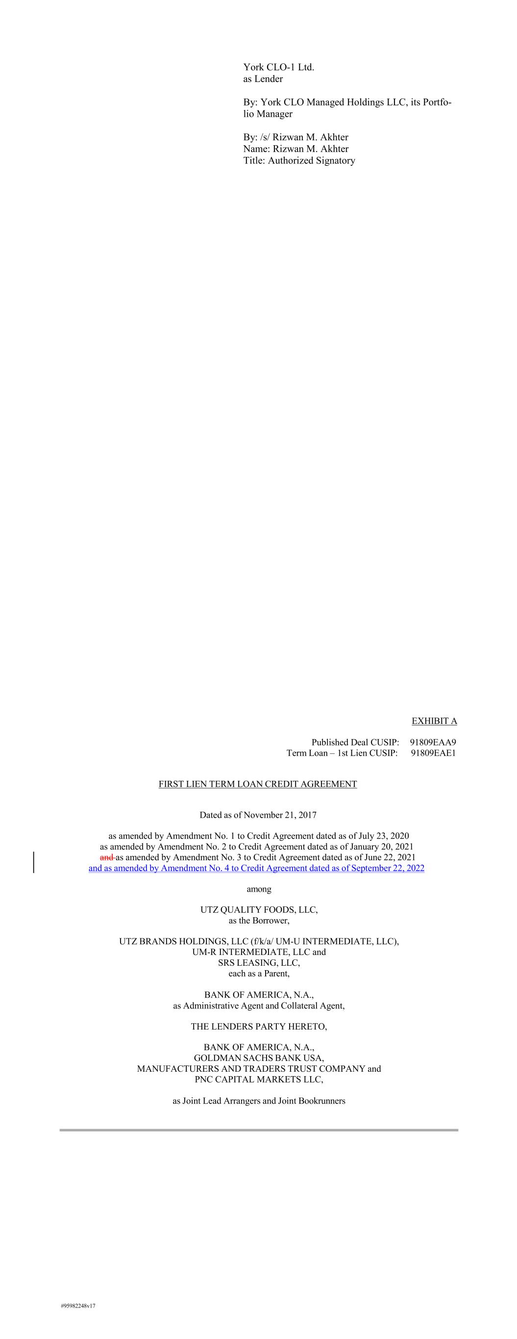 York CLO-1 Ltd. as Lender By: York CLO Managed Holdings LLC, its Portfo- lio Manager By: /s/ Rizwan M. Akhter Name: Rizwan M. Akhter Title: Authorized Signatory #95982248v17 EXHIBIT A Published Deal CUSIP: 91809EAA9 Term Loan – 1st Lien CUSIP: 91809EAE1 FIRST LIEN TERM LOAN CREDIT AGREEMENT Dated as of November 21, 2017 as amended by Amendment No. 1 to Credit Agreement dated as of July 23, 2020 as amended by Amendment No. 2 to Credit Agreement dated as of January 20, 2021 and as amended by Amendment No. 3 to Credit Agreement dated as of June 22, 2021 and as amended by Amendment No. 4 to Credit Agreement dated as of September 22, 2022 among UTZ QUALITY FOODS, LLC, as the Borrower, UTZ BRANDS HOLDINGS, LLC (f/k/a/ UM-U INTERMEDIATE, LLC), UM-R INTERMEDIATE, LLC and SRS LEASING, LLC, each as a Parent, BANK OF AMERICA, N.A., as Administrative Agent and Collateral Agent, THE LENDERS PARTY HERETO, BANK OF AMERICA, N.A., GOLDMAN SACHS BANK USA, MANUFACTURERS AND TRADERS TRUST COMPANY and PNC CAPITAL MARKETS LLC, as Joint Lead Arrangers and Joint Bookrunners