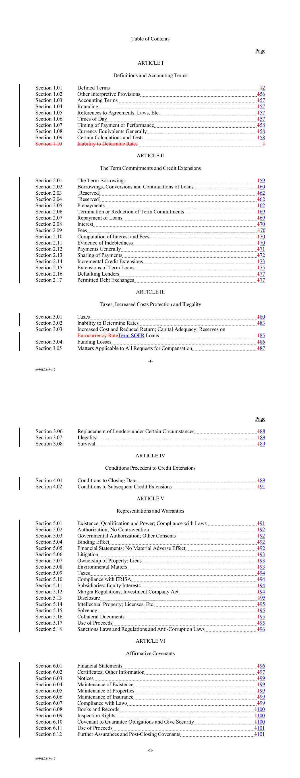 #95982248v17 Table of Contents Page ARTICLE I Definitions and Accounting Terms Section 1.01 Defined Terms 12 Section 1.02 Other Interpretive Provisions 156 Section 1.03 Accounting Terms 157 Section 1.04 Rounding 157 Section 1.05 References to Agreements, Laws, Etc. 157 Section 1.06 Times of Day 157 Section 1.07 Timing of Payment or Performance 158 Section 1.08 Currency Equivalents Generally 158 Section 1.09 Certain Calculations and Tests 158 Section 1.10 Inability to Determine Rates 1 ARTICLE II The Term Commitments and Credit Extensions Section 2.01 The Term Borrowings 159 Section 2.02 Borrowings, Conversions and Continuations of Loans 160 Section 2.03 [Reserved] 162 Section 2.04 [Reserved] 162 Section 2.05 Prepayments 162 Section 2.06 Termination or Reduction of Term Commitments 169 Section 2.07 Repayment of Loans 169 Section 2.08 Interest 170 Section 2.09 Fees 170 Section 2.10 Computation of Interest and Fees 170 Section 2.11 Evidence of Indebtedness 170 Section 2.12 Payments Generally 171 Section 2.13 Sharing of Payments 172 Section 2.14 Incremental Credit Extensions 173 Section 2.15 Extensions of Term Loans. 175 Section 2.16 Defaulting Lenders 177 Section 2.17 Permitted Debt Exchanges 177 ARTICLE III Taxes, Increased Costs Protection and Illegality Section 3.01 Taxes 180 Section 3.02 Inability to Determine Rates 183 Section 3.03 Increased Cost and Reduced Return; Capital Adequacy; Reserves on Eurocurrency RateTerm SOFR Loans 185 Section 3.04 Funding Losses 186 Section 3.05 Matters Applicable to All Requests for Compensation 187 -i- #95982248v17 Page Section 3.06 Replacement of Lenders under Certain Circumstances 188 Section 3.07 Illegality 189 Section 3.08 Survival 189 ARTICLE IV Conditions Precedent to Credit Extensions Section 4.01 Conditions to Closing Date 189 Section 4.02 Conditions to Subsequent Credit Extensions 191 ARTICLE V Representations and Warranties Section 5.01 Existence, Qualification and Power; Compliance with Laws 191 Section 5.02 Authorization; No Contravention 192 Section 5.03 Governmental Authorization; Other Consents 192 Section 5.04 Binding Effect 192 Section 5.05 Financial Statements; No Material Adverse Effect 192 Section 5.06 Litigation 193 Section 5.07 Ownership of Property; Liens 193 Section 5.08 Environmental Matters 193 Section 5.09 Taxes 194 Section 5.10 Compliance with ERISA 194 Section 5.11 Subsidiaries; Equity Interests 194 Section 5.12 Margin Regulations; Investment Company Act 194 Section 5.13 Disclosure 195 Section 5.14 Intellectual Property; Licenses, Etc. 195 Section 5.15 Solvency 195 Section 5.16 Collateral Documents 195 Section 5.17 Use of Proceeds 195 Section 5.18 Sanctions Laws and Regulations and Anti-Corruption Laws 196 ARTICLE VI Affirmative Covenants Section 6.01 Financial Statements 196 Section 6.02 Certificates; Other Information 197 Section 6.03 Notices 199 Section 6.04 Maintenance of Existence 199 Section 6.05 Maintenance of Properties 199 Section 6.06 Maintenance of Insurance 199 Section 6.07 Compliance with Laws 199 Section 6.08 Books and Records 1100 Section 6.09 Inspection Rights 1100 Section 6.10 Covenant to Guarantee Obligations and Give Security 1100 Section 6.11 Use of Proceeds 1101 Section 6.12 Further Assurances and Post-Closing Covenants 1101 -ii-